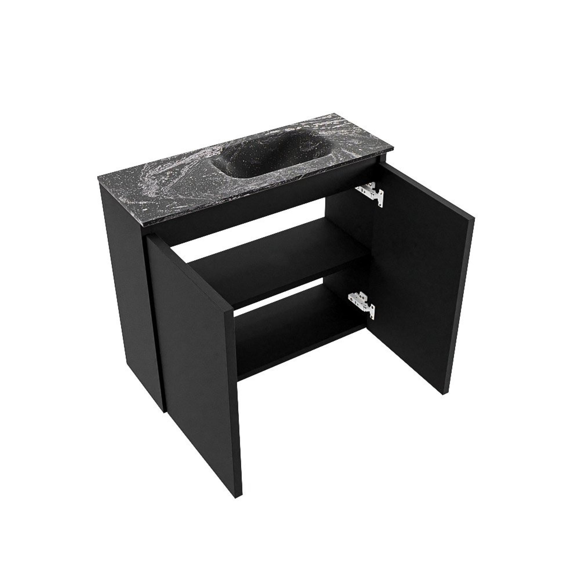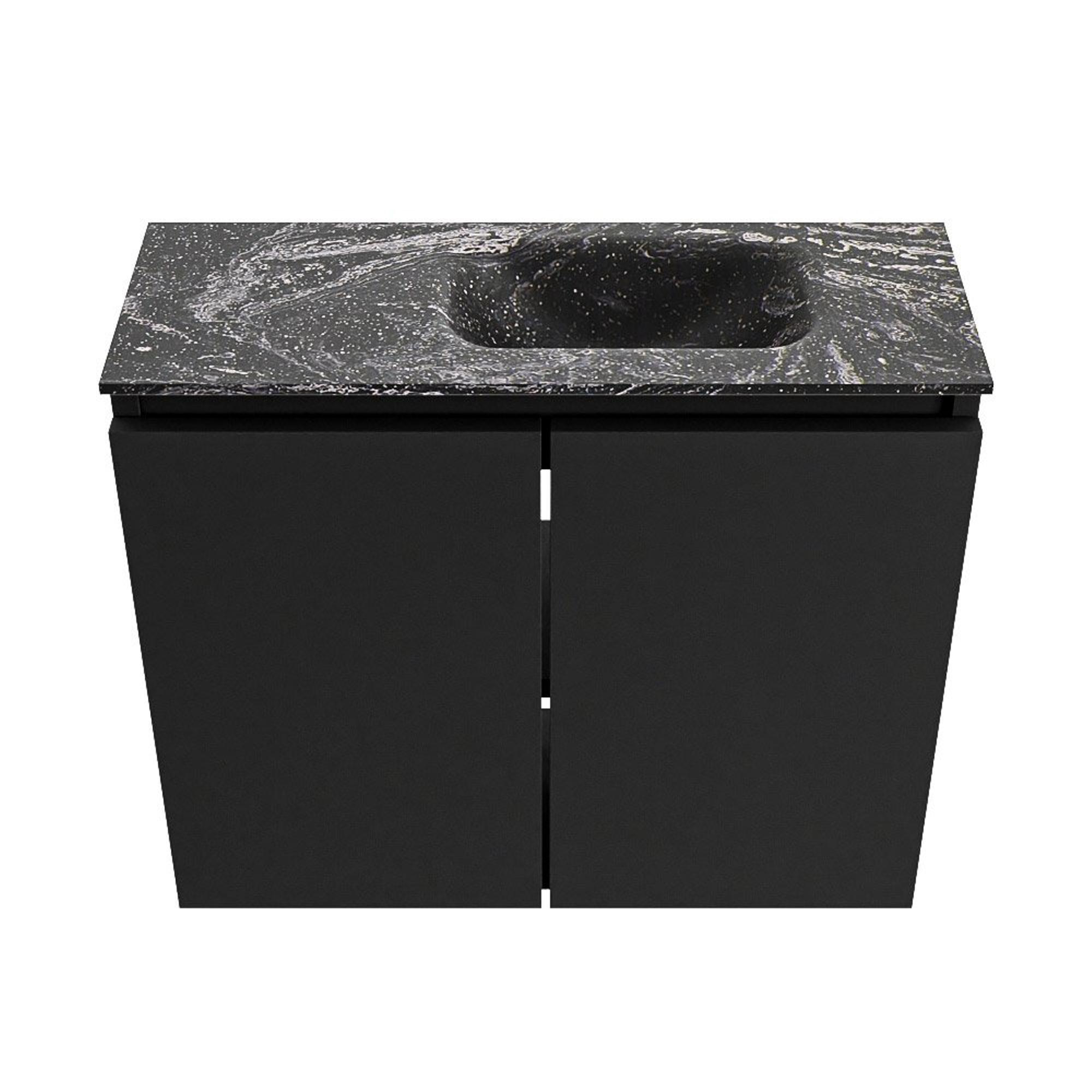 La combinaison de la couleur Urban du meuble et du lavabo noir Lava confère immédiatement à votre WC un aspect haut de gamme et design. Le plan et le lavabo sont réalisés en solid surface, ce qui crée un ensemble lisse, sans joints et au rendu luxueux. Le lavabo foncé se détache subtilement du meuble et s’accorde parfaitement avec les intérieurs modernes dotés d’accents noirs, comme les robinets noirs, profilés de douche ou accessoires. Grâce à la façade sans poignées, l’ensemble paraît calme et minimaliste, ce qui donne à un petit espace une impression plus grande et plus ordonnée. Vous créez ainsi avec un seul meuble un look contemporain bien étudié.