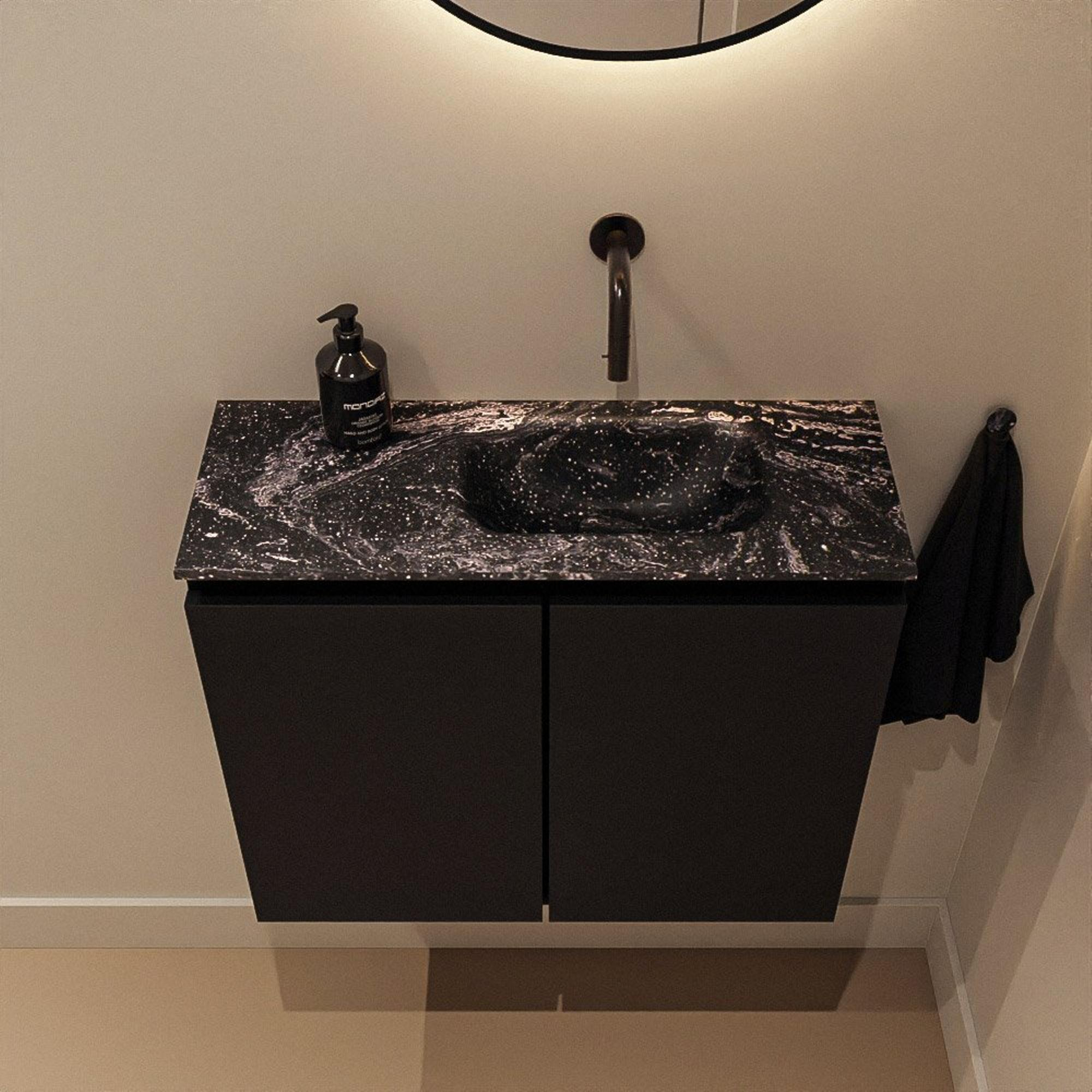 Vous recherchez un meuble épuré et compact pour transformer votre WC ou votre petite salle de bains en un espace calme et luxueux ? Ce meuble WC moderne avec faible profondeur vous offre exactement cela : un petit meuble élégant sans poignées avec un lavabo de haute qualité dans une profonde couleur Lava. Grâce à sa largeur de 60 cm et sa profondeur de seulement 23 cm, il s’intègre parfaitement dans les espaces plus étroits, sans que vous ayez à sacrifier le confort ou l’apparence. Le lavabo noir en solid surface forme un bel ensemble avec le plan, tandis que la couleur Urban du meuble crée une ambiance chaleureuse et contemporaine. Idéal pour le WC, la petite salle de bains ou une salle de bains d’appoint chic où vous souhaitez faire forte impression, sans avoir la place pour un grand meuble de salle de bains.