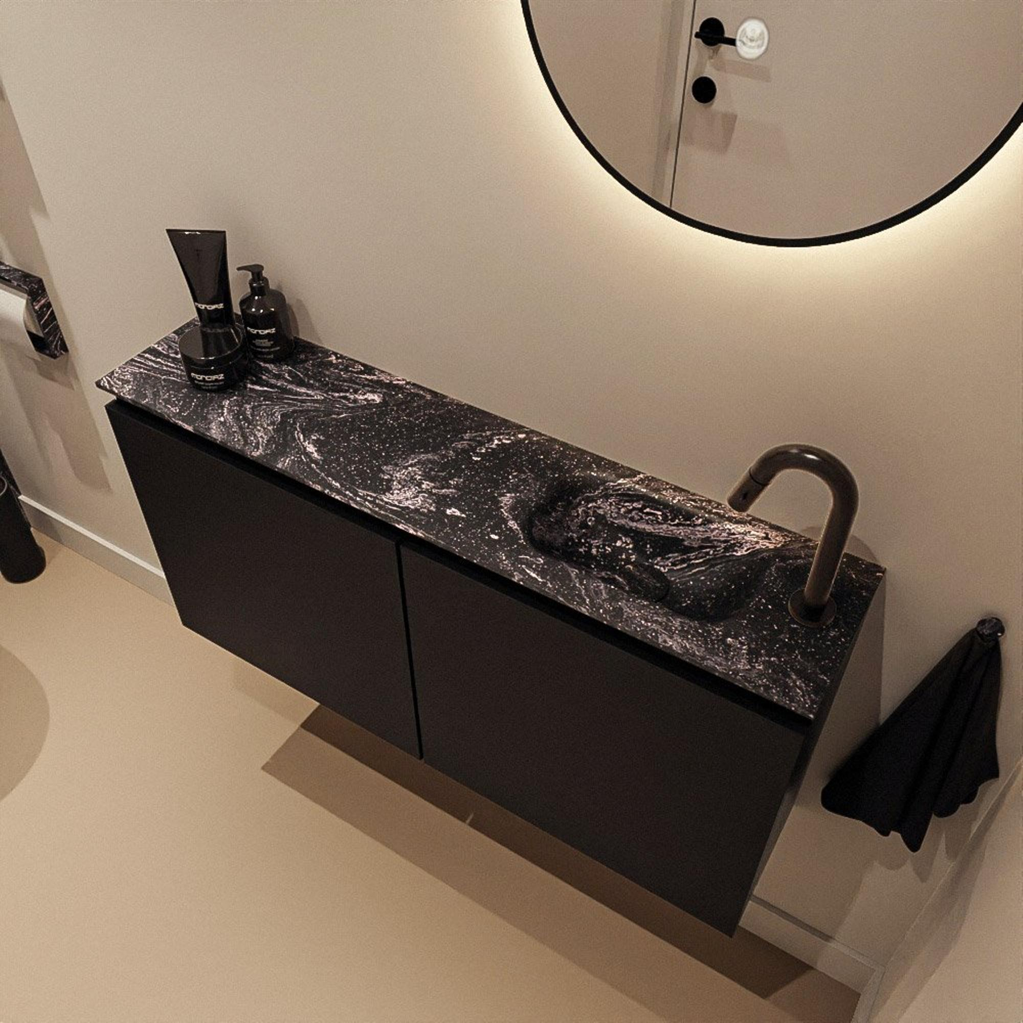 La couleur Urban du meuble, combinée au lavabo noir Eden en Lava, crée une ambiance forte et moderne qui s’intègre parfaitement dans les intérieurs contemporains. Les équipements sanitaires noirs sont populaires car ils confèrent immédiatement une allure d’hôtel chic, en particulier dans des toilettes ou un guest bathroom où vous souhaitez impressionner vos visiteurs. Les façades épurées sans poignée assurent un look minimaliste sans perturbation visuelle ; l’ensemble paraît calme et très net. Grâce à ce design contemporain, ce meuble se marie parfaitement avec des robinets noirs, des carreaux foncés ou au contraire des murs clairs contrastants pour un ensemble chic et équilibré.