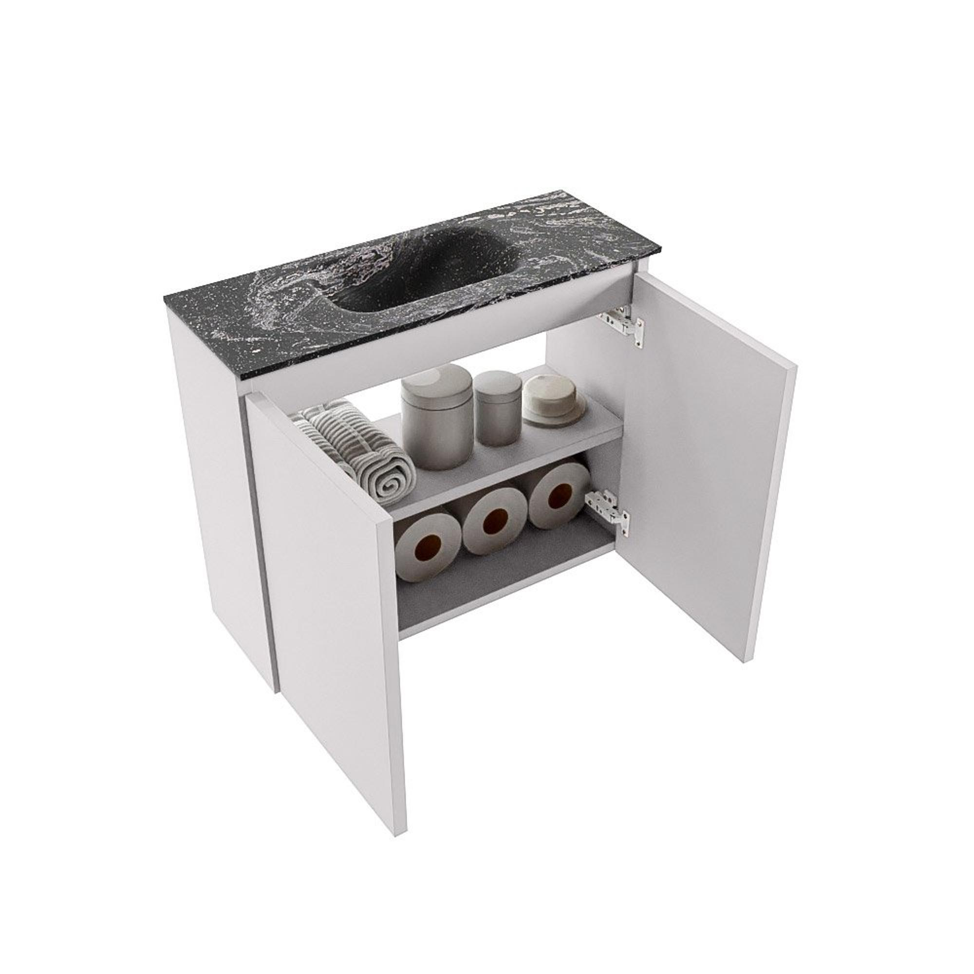 Avec des dimensions de 60x23x50 cm, ce meuble est spécialement conçu pour les salles de bains compactes et les espaces toilettes. La faible profondeur permet de conserver l’espace de circulation, sans sacrifier la fonctionnalité. La largeur de 60 cm offre suffisamment de place pour le lavabo et un espace de lavage confortable, tout en ne nécessitant pas un grand pan de mur. Cela rend le meuble très adapté, par exemple, à un WC étroit, à une niche à côté des toilettes ou à une petite salle de bains d’amis. Comme le lavabo est positionné au centre, l’ensemble paraît symétrique et apaisant, ce qui contribue à une apparence ordonnée et aérée.