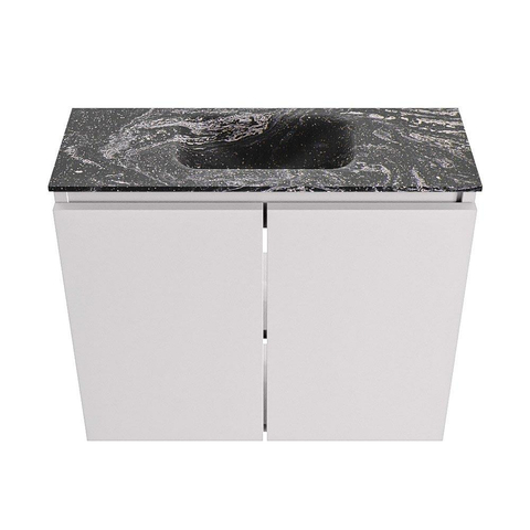 La couleur Cale du meuble est un gris moderne qui se combine facilement avec une grande variété de couleurs et de styles de carrelage, du béton aux teintes bois chaleureuses. Le plan de lavabo foncé en Lava s’y accorde à merveille et crée une atmosphère luxueuse, presque digne d’un hôtel. Les lignes épurées, les façades sans poignées et le design minimaliste s’intègrent parfaitement dans un style de salle de bains moderne ou industriel. Grâce à l’utilisation de MDF pour le meuble et d’un plan en solid surface, l’ensemble paraît sobre et haut de gamme, tout en vous laissant la liberté de choisir vous-même un robinet dans la couleur de votre choix, par exemple chrome, noir ou laiton brossé.