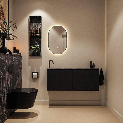 La finition Urban combinée au plan de vasque noir et à la vasque Lava donne immédiatement à vos toilettes une apparence contemporaine et luxueuse. Le meuble s’harmonise parfaitement avec les salles de bains modernes et industrielles, par exemple en combinaison avec des robinets noirs, des carreaux sombres ou un sol aspect béton. La façade sans poignées crée un jeu de lignes sobre et minimaliste et met réellement en valeur les formes du meuble. Grâce à ces lignes épurées, même un petit espace paraît visuellement plus grand, tout en permettant de créer une véritable déclaration de design.