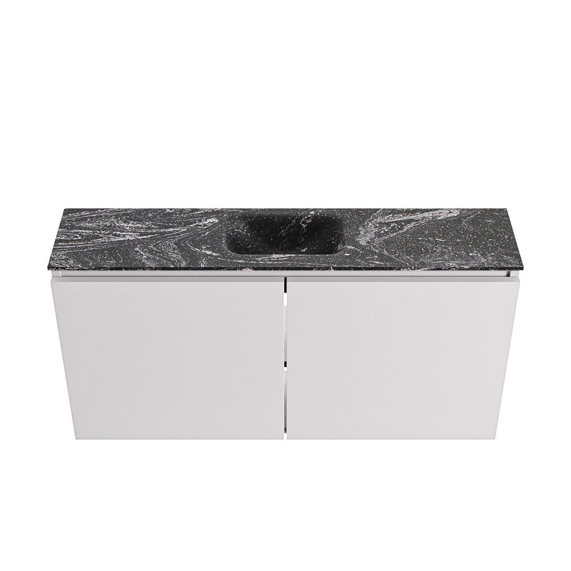 - Combinaison moderne d’un meuble gris (Cale) avec un plan de lavabo foncé Lava pour une apparence luxueuse et apaisante.