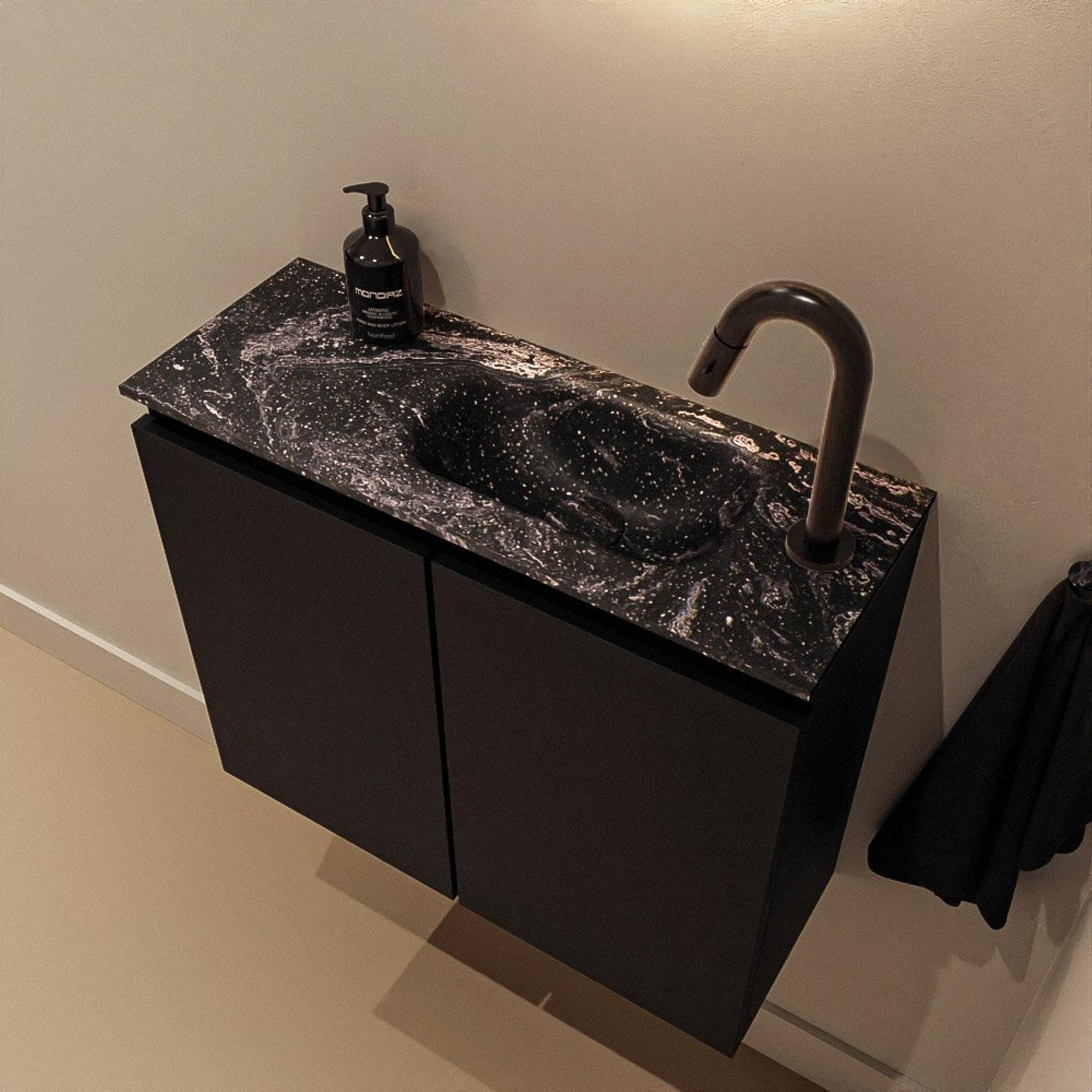 La couleur moderne Urban du meuble forme un duo élégant avec le lavabo noir Lava. Ce contraste puissant s’accorde parfaitement avec les tendances actuelles de la salle de bains, comme le sanitaire noir, les carreaux aspect béton et les intérieurs minimalistes. Les façades sans poignées assurent une apparence calme et épurée et complètent parfaitement l’ensemble. Comme le plan et la cuve sont réalisés dans la même tonalité sombre, le meuble ressemble à un seul bloc luxueux, ce qui donne immédiatement à votre espace une allure haut de gamme et étudiée. Associez-le à un robinet noir ou en métal brossé et à des accessoires assortis pour parfaire le look.
