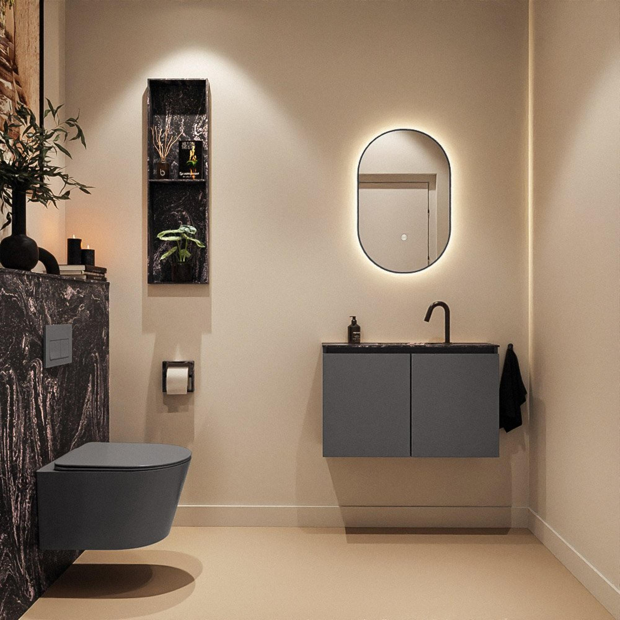 Ce meuble de toilettes compact est un choix malin si vous disposez d’un espace WC étroit ou d’une petite salle de bains, mais que vous ne voulez pas faire de compromis sur le style et la facilité de rangement. Grâce à ses dimensions peu profondes, il s’intègre facilement dans une niche ou le long d’un petit mur, tandis que son design épuré s’accorde parfaitement avec un style d’intérieur moderne. La combinaison d’un meuble gris foncé avec un lavabo noir crée une ambiance luxe, digne d’un hôtel, qui trouve aussi parfaitement sa place dans une salle de bains design. Grâce au lavabo intégré avec trou de robinet au milieu, ce meuble est idéal pour une utilisation quotidienne dans les toilettes ou la petite salle de bains d’appoint, par exemple si vous souhaitez offrir à vos invités un point d’eau propre, stylé et pratique, sans que l’espace paraisse encombré.