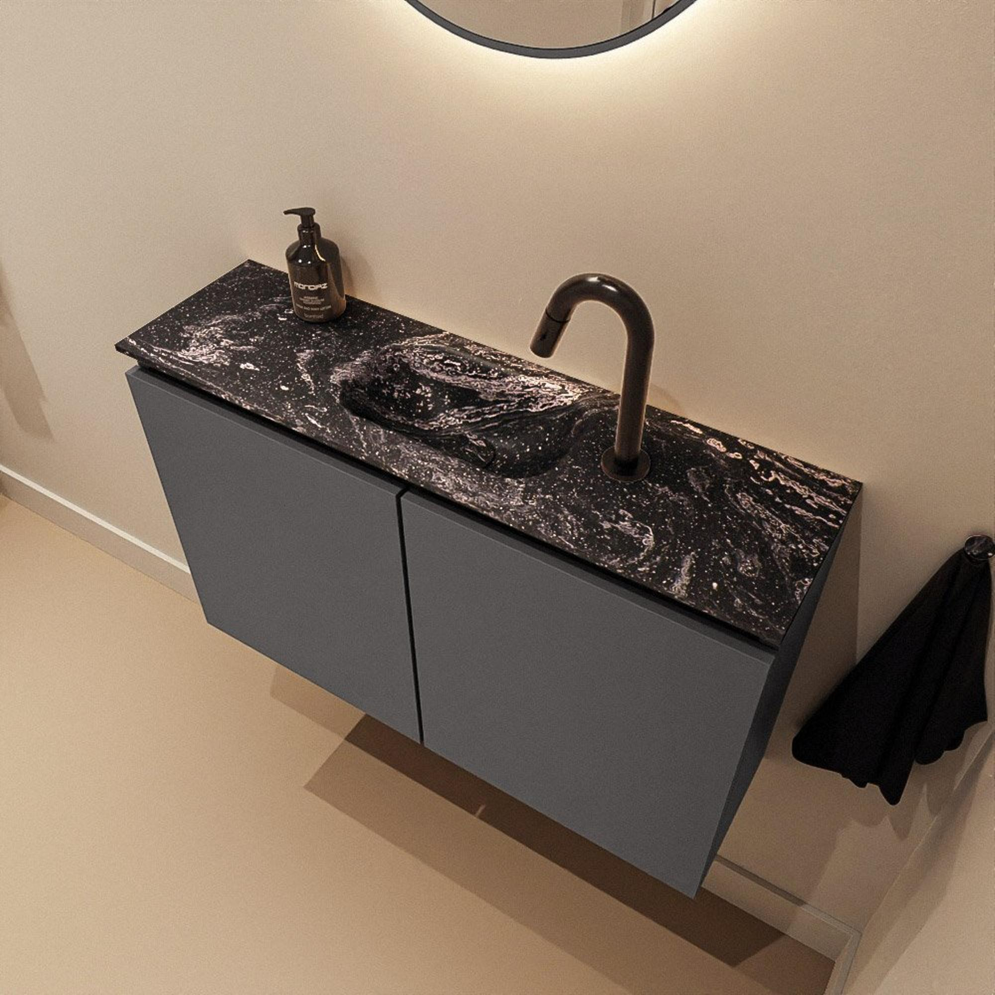 La couleur gris foncé moderne du meuble constitue une base magnifique pour de nombreuses combinaisons de carrelages et de couleurs, du béton à des tons bois chaleureux. Le plan de toilette noir en Solid Surface, dans la couleur Lava, apporte une touche puissante et contemporaine et s’harmonise parfaitement avec des robinets et accessoires noirs. Les lignes épurées et la finition sans poignées assurent un look minimaliste sans interruptions, donnant à l’ensemble une apparence calme et haut de gamme. Vous créez ainsi avec un seul meuble un élément accrocheur et élégant dans un espace pourtant réduit, sans que celui-ci paraisse surchargé.