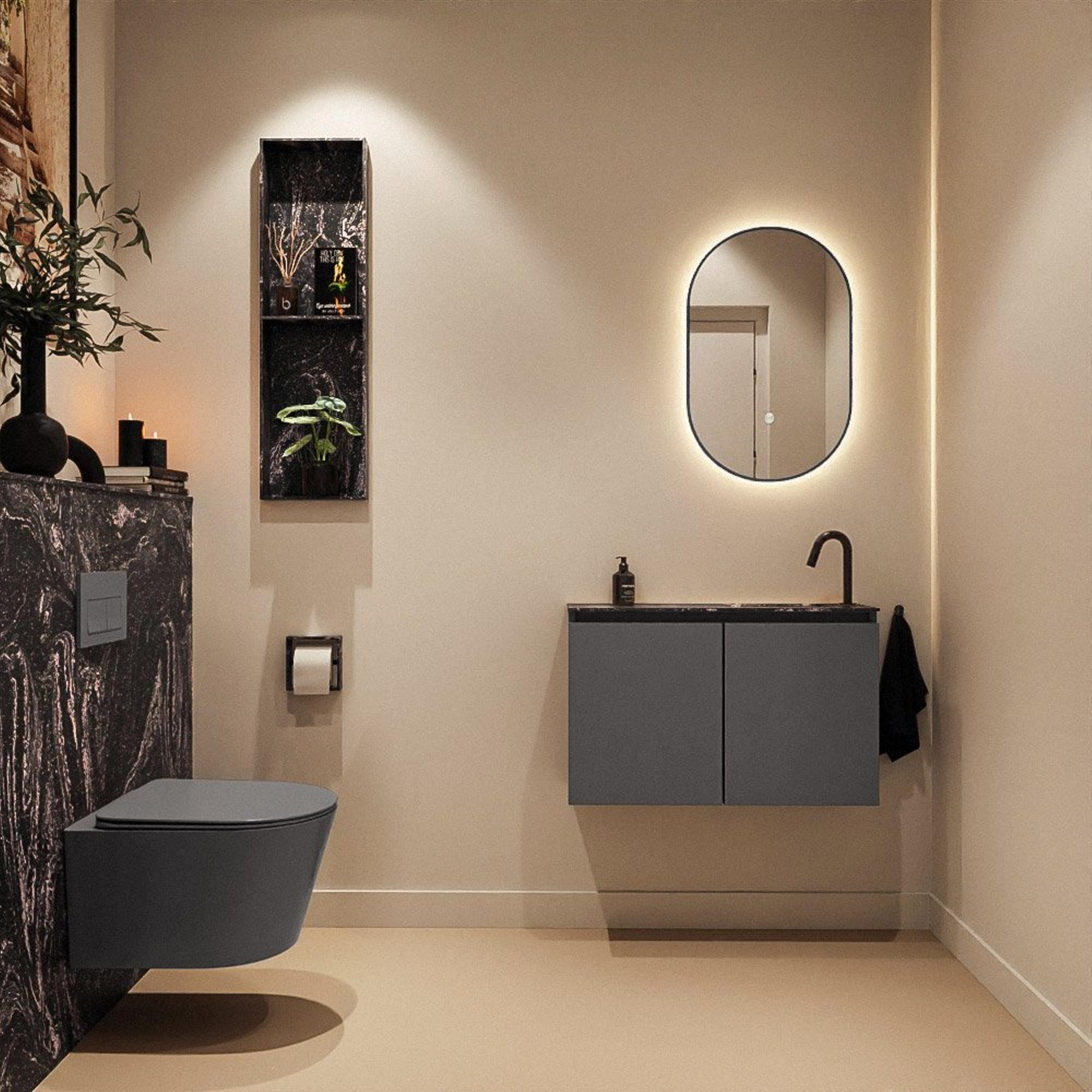 La couleur foncée du meuble Dark Grey combinée au plan en solid surface noir offre un look moderne et haut de gamme. Cette combinaison de couleurs s'accorde parfaitement avec des tendances populaires comme les robinets noirs, les accessoires foncés et les carreaux aspect béton. Grâce à ses lignes sobres et à son design sans poignées, le meuble paraît épuré et ordonné, ce qui fait une grande différence surtout dans les petits espaces. Vous créez une ambiance d'hôtel de luxe dans vos propres toilettes ou salle de bains, tandis que les couleurs neutres se marient facilement avec des murs et des sols clairs comme foncés.