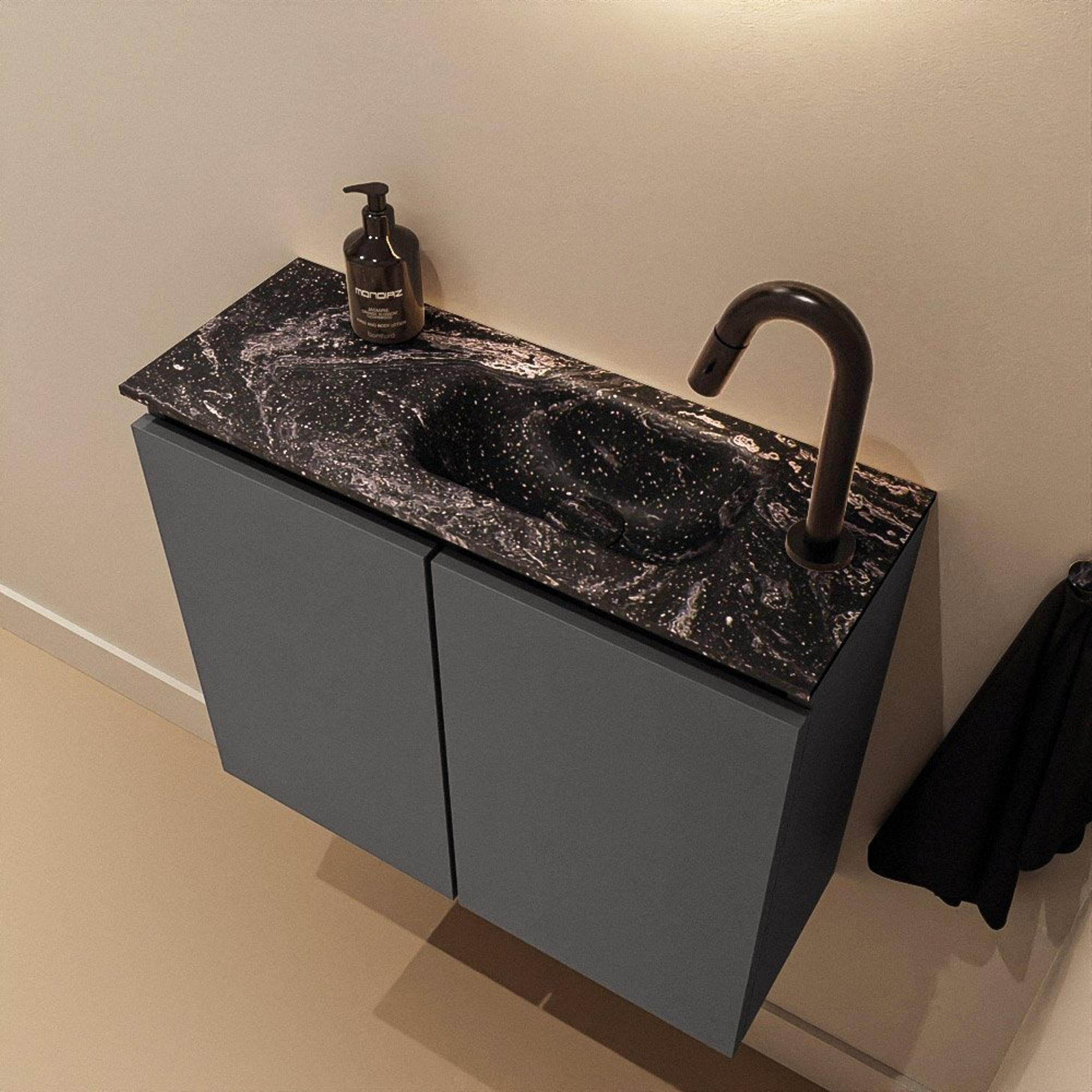 Look moderne avec meuble sombre et lavabo noir