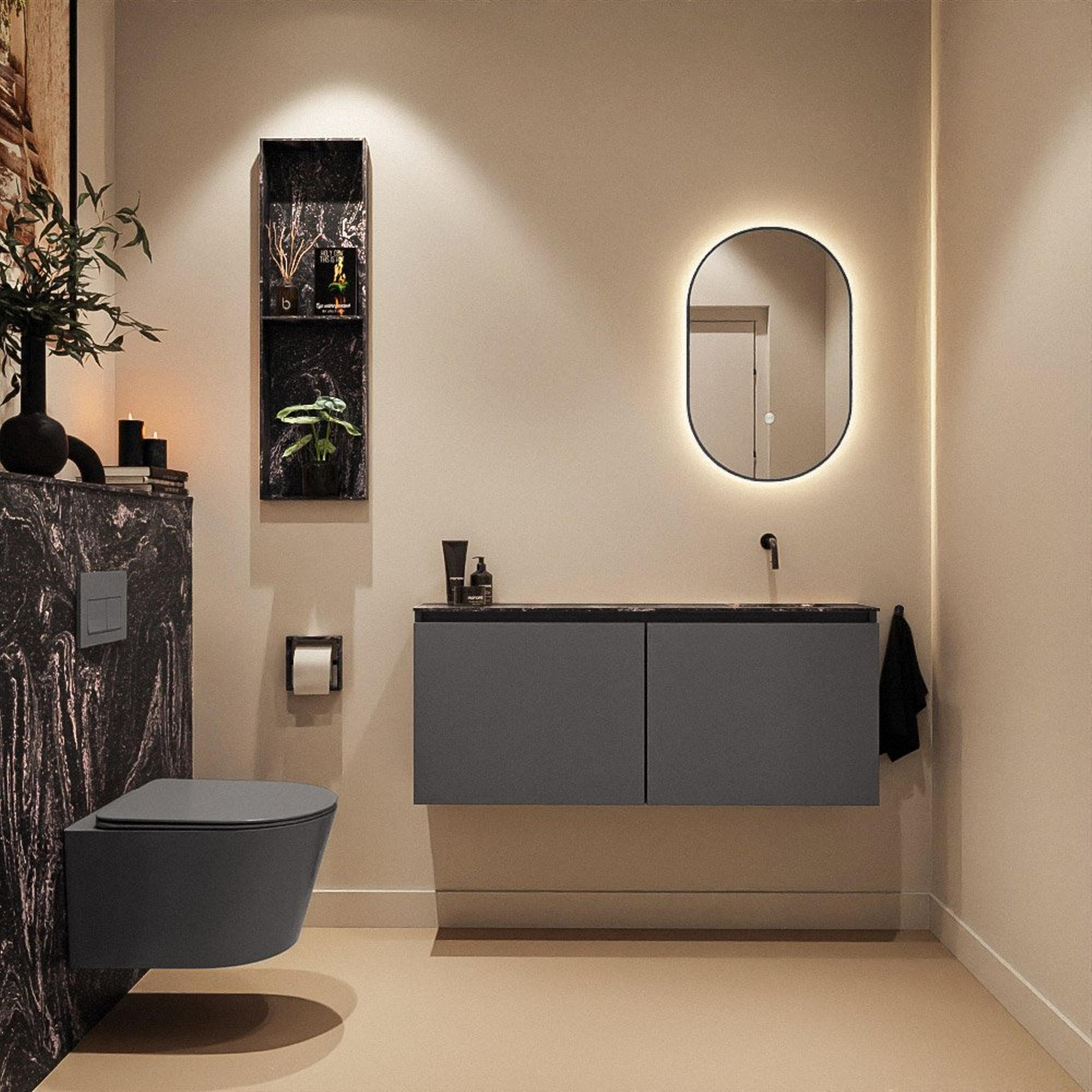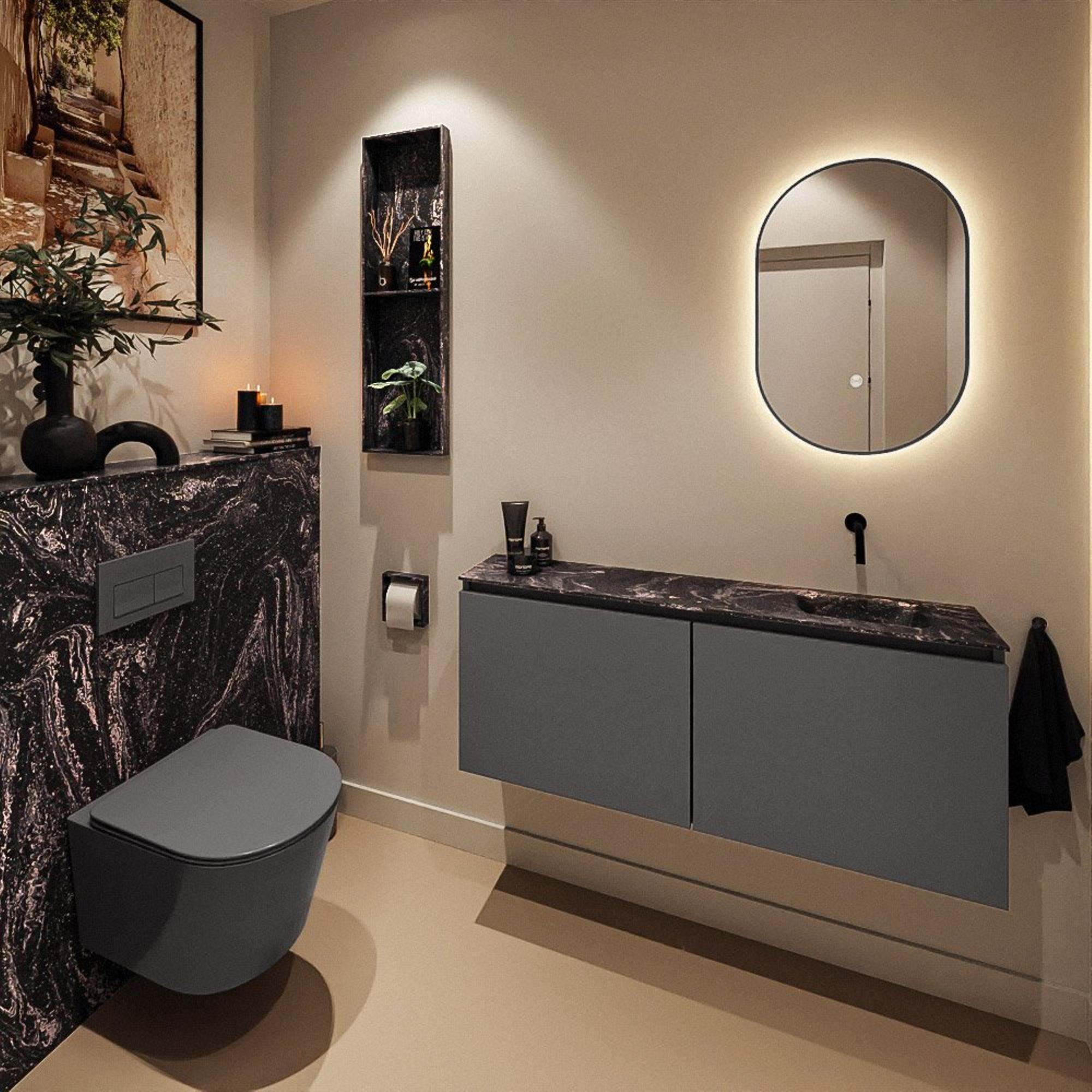 Le lavabo Eden en Lava est positionné à droite, ce qui crée sur la gauche une large surface de dépose pour les articles de toilette quotidiens. Comme le lavabo ne possède pas de trou de robinet, vous combinez idéalement cet ensemble avec un robinet mural au-dessus de la cuve. Non seulement cela offre une apparence épurée et luxueuse, mais cela facilite aussi le nettoyage autour du lavabo : aucun recoin difficile ni joint de silicone autour d’un robinet. L’exécution en solid surface du plan procure une sensation de robustesse et de qualité et se nettoie facilement, ce qui est appréciable dans une pièce très utilisée. De plus, le meuble est sans poignées, ce qui contribue à un ensemble ordonné et intemporel.
