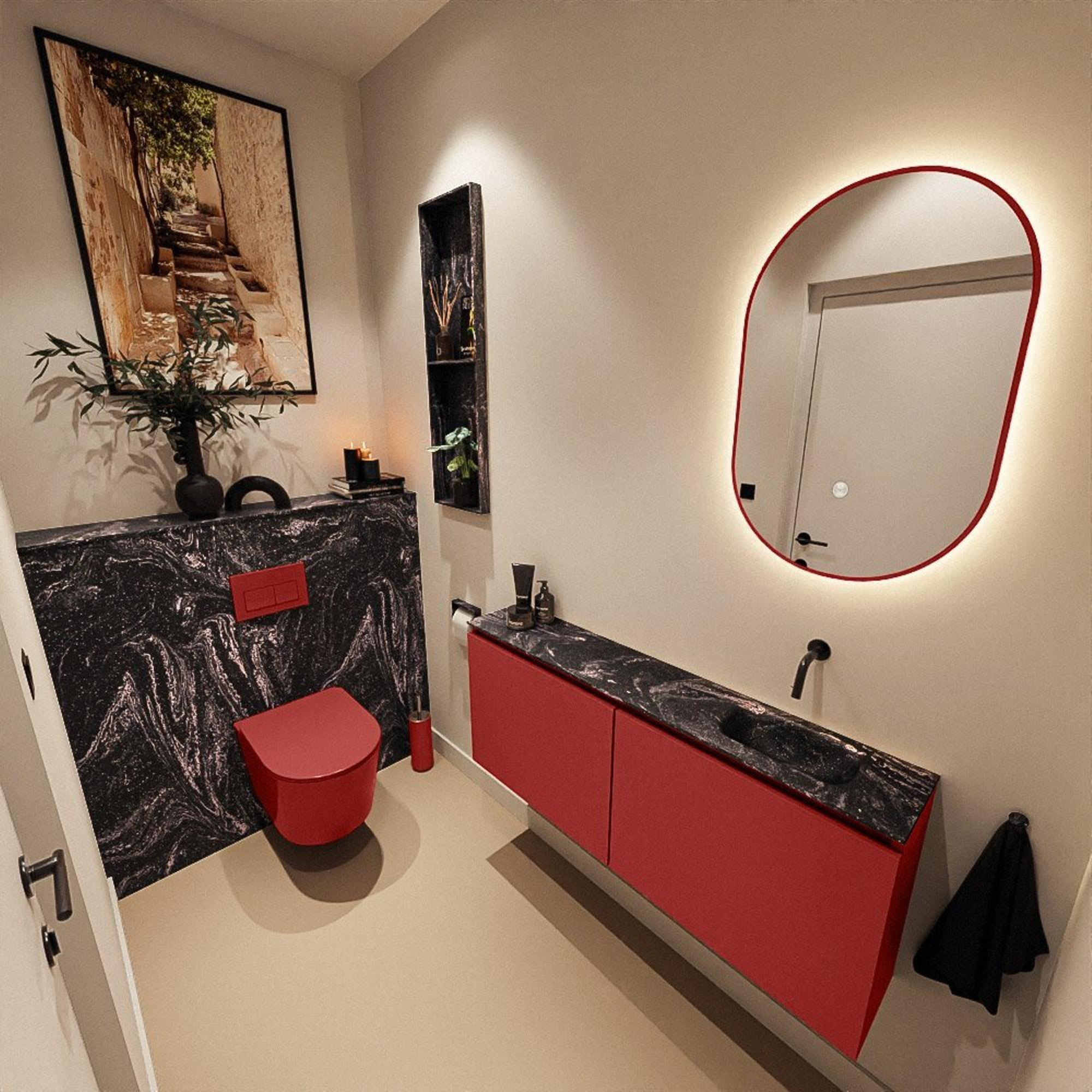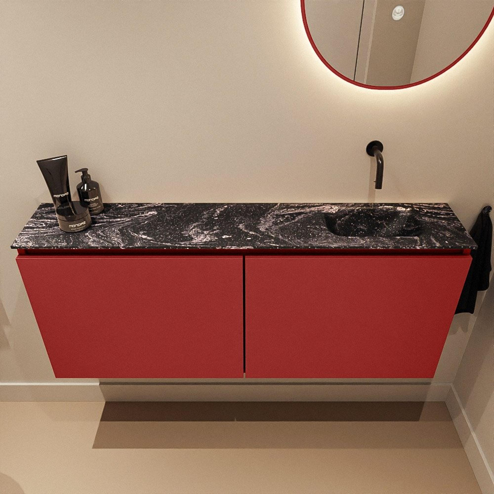 - Meuble élégant en coloris Fire (teinte rouge) combiné à un lavabo Eden noir en Lava pour une apparence luxueuse et contemporaine.