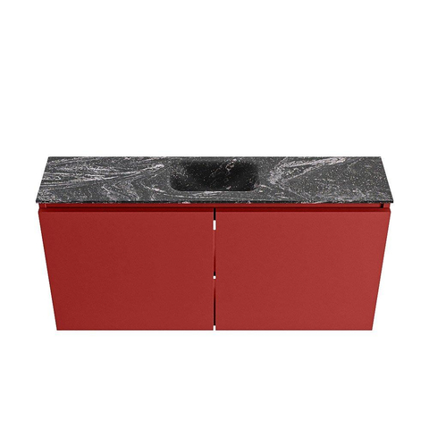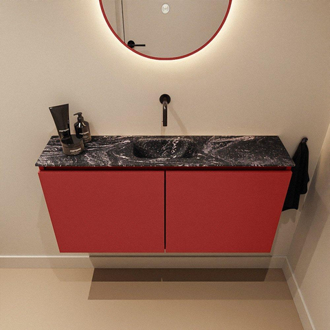 - Combinaison de couleurs élégante : caisson en Fire (teinte rouge) avec lavabo noir Lava pour une apparence luxueuse et moderne.
