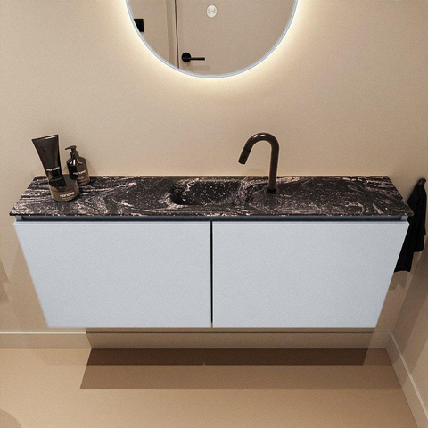 La couleur moderne Clay confère au meuble un aspect doux et contemporain qui se combine parfaitement avec des robinets noirs, des carreaux aspect béton ou des tons bois chaleureux. Le plan de lavabo noir en solid surface dans la couleur Lava crée un contraste marqué et fait de l’ensemble un véritable point de mire. Le solid surface est réputé pour son aspect mat épuré et sa finition haut de gamme, ce qui donne immédiatement un cachet luxueux à vos toilettes. Grâce au trou de robinet central, vous pouvez facilement installer un robinet assorti, par exemple en noir ou en chrome, afin de prolonger harmonieusement le style de vos sanitaires. Vous créez ainsi un look cohérent et design, même dans le plus petit espace.