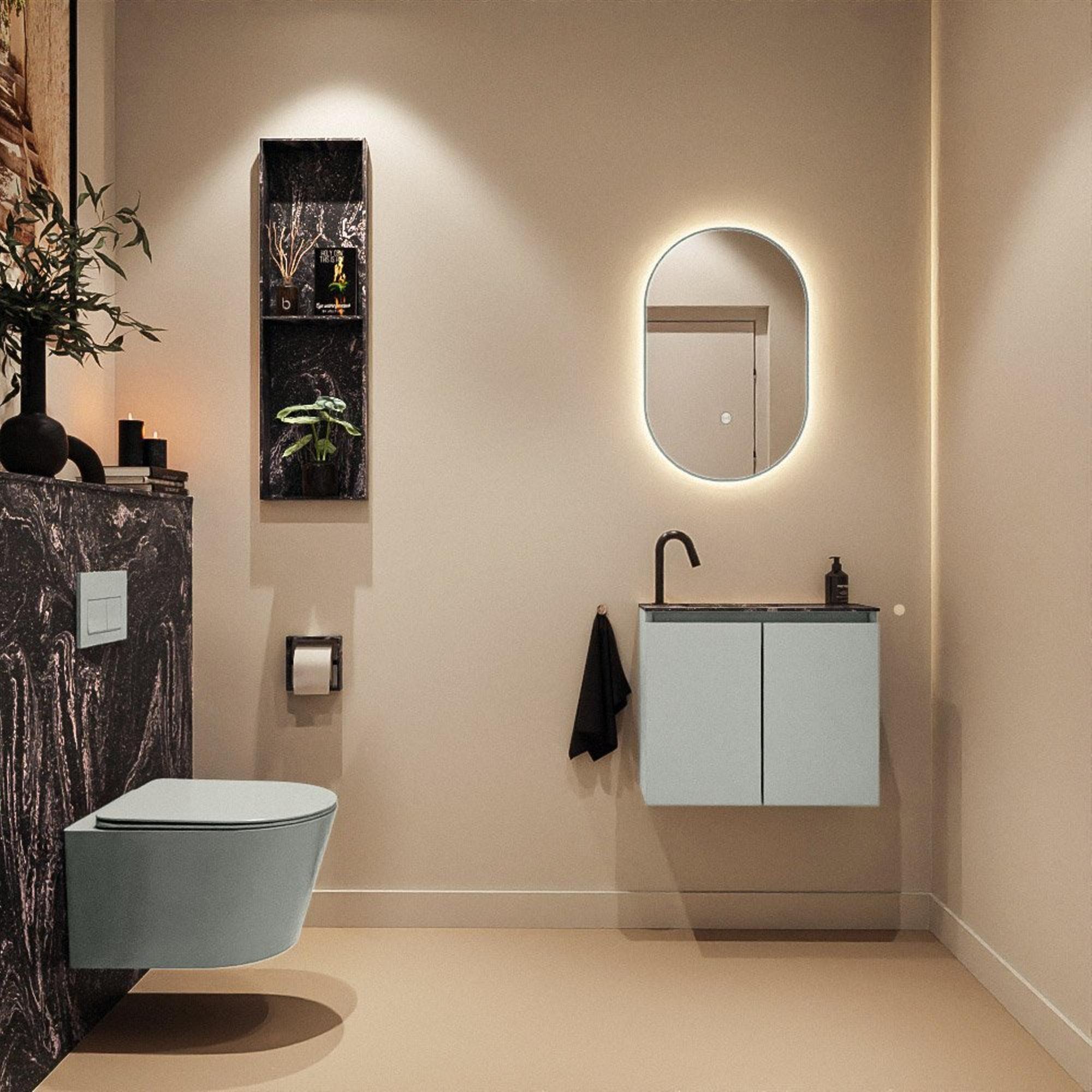Avec une largeur de 60 cm et une faible profondeur de 23 cm, ce meuble est parfait pour les petits espaces toilettes et les salles de bains étroites. Vous profitez d’un lavabo à part entière et d’une configuration fonctionnelle, sans que l’ensemble paraisse massif ou ne prenne trop de place. La hauteur de 50 cm assure une hauteur d’utilisation confortable, même dans un espace réduit. Comme le lavabo se trouve à gauche, vous pouvez positionner le meuble intelligemment par rapport à la porte et au mur, de sorte que votre liberté de mouvement reste optimale. Cela en fait un excellent choix pour la rénovation de toilettes existantes, mais aussi dans les constructions neuves où chaque centimètre compte et où vous souhaitez tout de même combiner confort et design.
