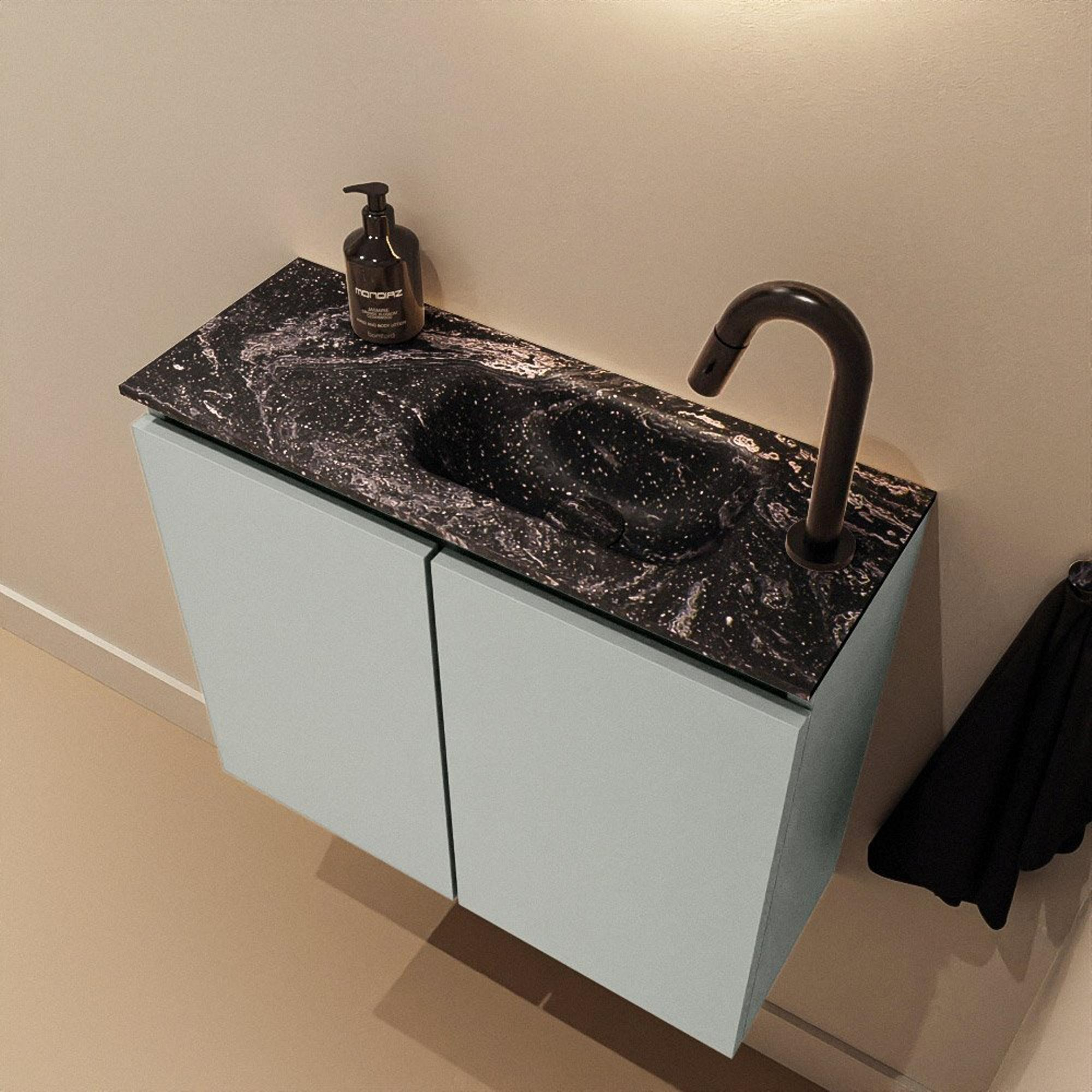 Ce meuble de toilette compact est idéal si vous souhaitez créer une apparence luxueuse et ordonnée dans un espace plus réduit. Pensez à un espace WC, une salle de bains étroite ou un deuxième WC où chaque centimètre compte, mais où vous ne voulez faire aucune concession sur le design. La faible profondeur donne au meuble un caractère particulièrement aéré, tandis que la combinaison d’un lavabo aux lignes épurées et de portes de meuble sans poignées assure un look moderne et apaisant. Grâce à la teinte grise neutre du meuble et au lavabo noir au caractère robuste, l’ensemble se combine facilement avec différents styles, du moderne industriel au minimalisme scandinave. Vous obtenez ainsi une solution pratique et élégante, qui supporte sans effort à la fois l’usage quotidien et le confort nécessaire pour recevoir des invités.