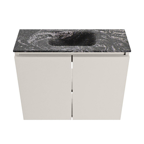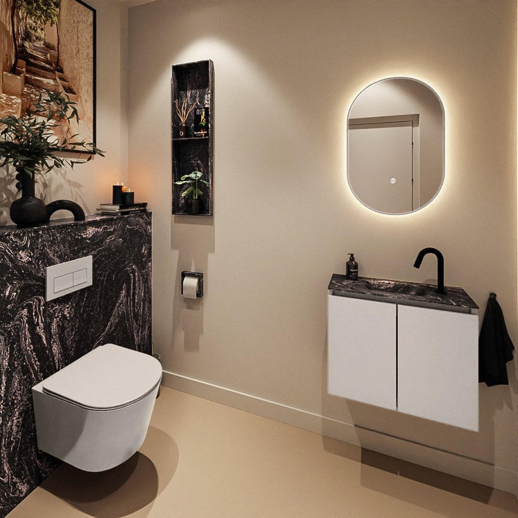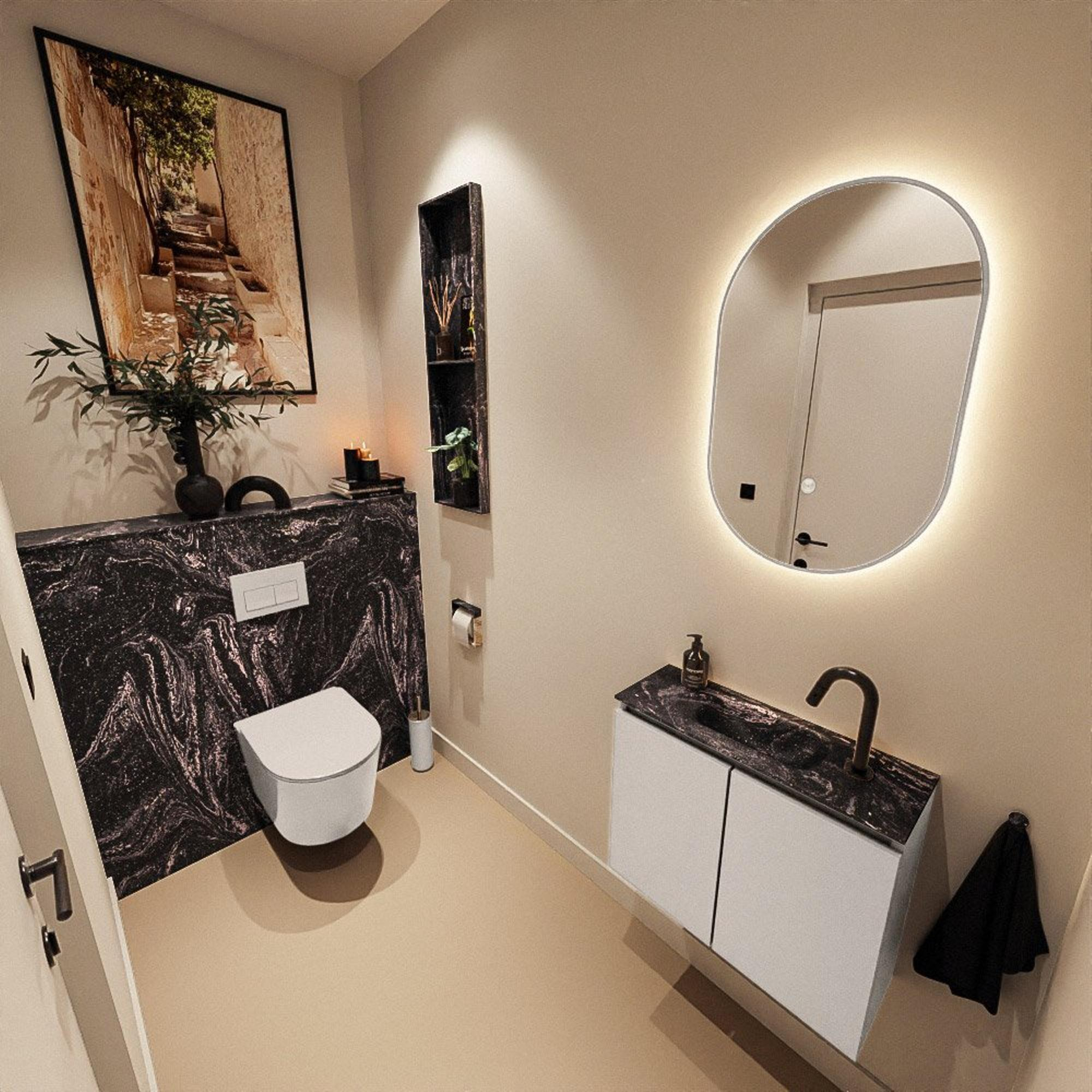 La couleur Linen du meuble offre un aspect bois doux et moderne qui se marie facilement avec des carreaux blancs, gris ou couleur sable. Le lavabo sombre Lava en solid surface contraste joliment avec celui-ci et ajoute une touche luxueuse. Cette combinaison de couleurs convient parfaitement à un intérieur moderne ou scandinave, mais fonctionne également très bien dans un cadre robuste et industriel avec des accessoires noirs. Comme le meuble est sans poignées, les lignes restent calmes et épurées, ce qui contribue encore davantage à une apparence ordonnée et spacieuse. Vous créez ainsi avec un seul meuble un look réfléchi et cohérent dans vos toilettes.