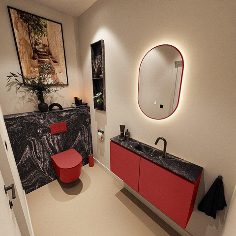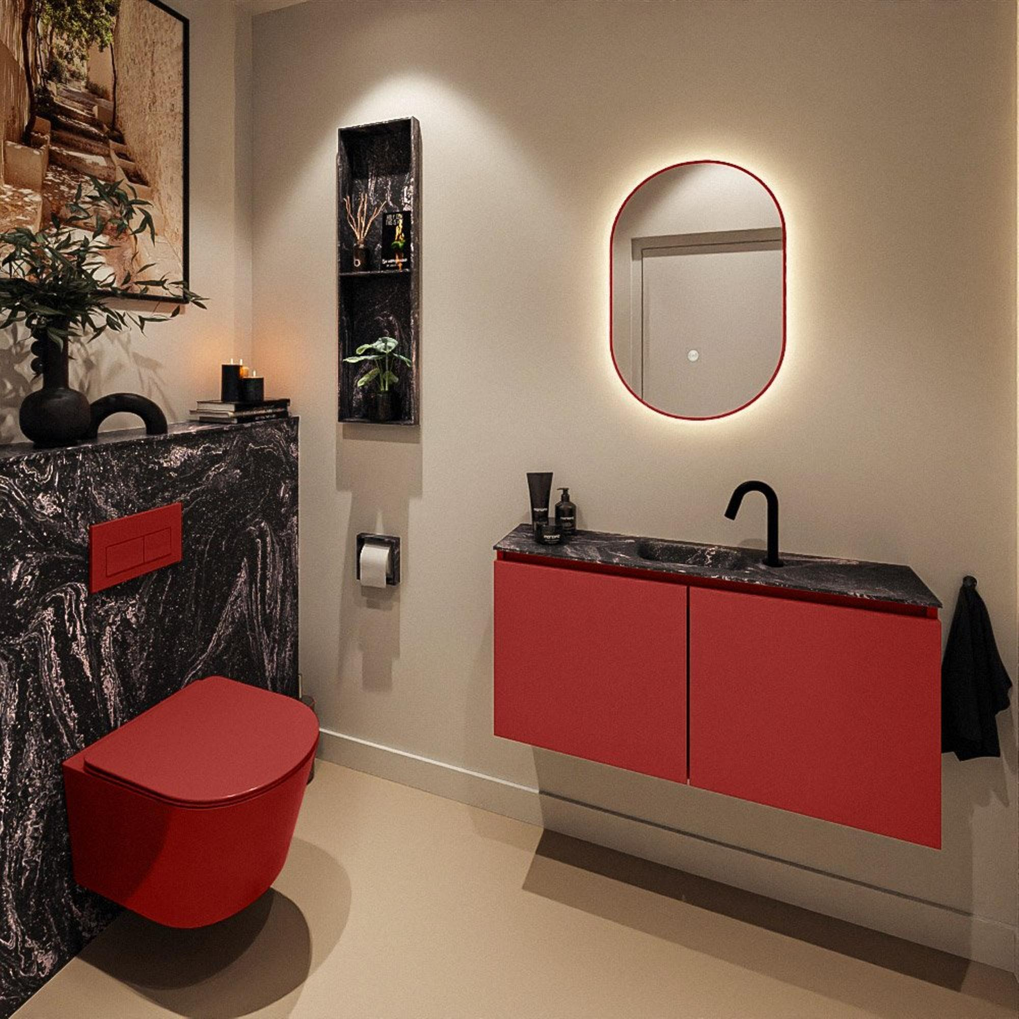 La couleur flamboyante Fire du meuble constitue un accent fort dans vos toilettes, tandis que le plan noir et le lavabo Eden couleur Lava apportent une allure moderne et élégante. Cette combinaison s’accorde parfaitement avec des salles de bains de style industriel, hôtel chic ou minimalisme moderne. La finition sans poignées offre un ensemble épuré sans interruptions, permettant aux couleurs et aux lignes du meuble de vraiment s’exprimer. En combinaison avec des accessoires noirs ou noir mat, vous créez facilement un ensemble harmonieux. Si vous souhaitez donner un caractère supplémentaire à vos toilettes, cette combinaison de couleurs affirmée mais néanmoins élégante est un véritable coup de maître.