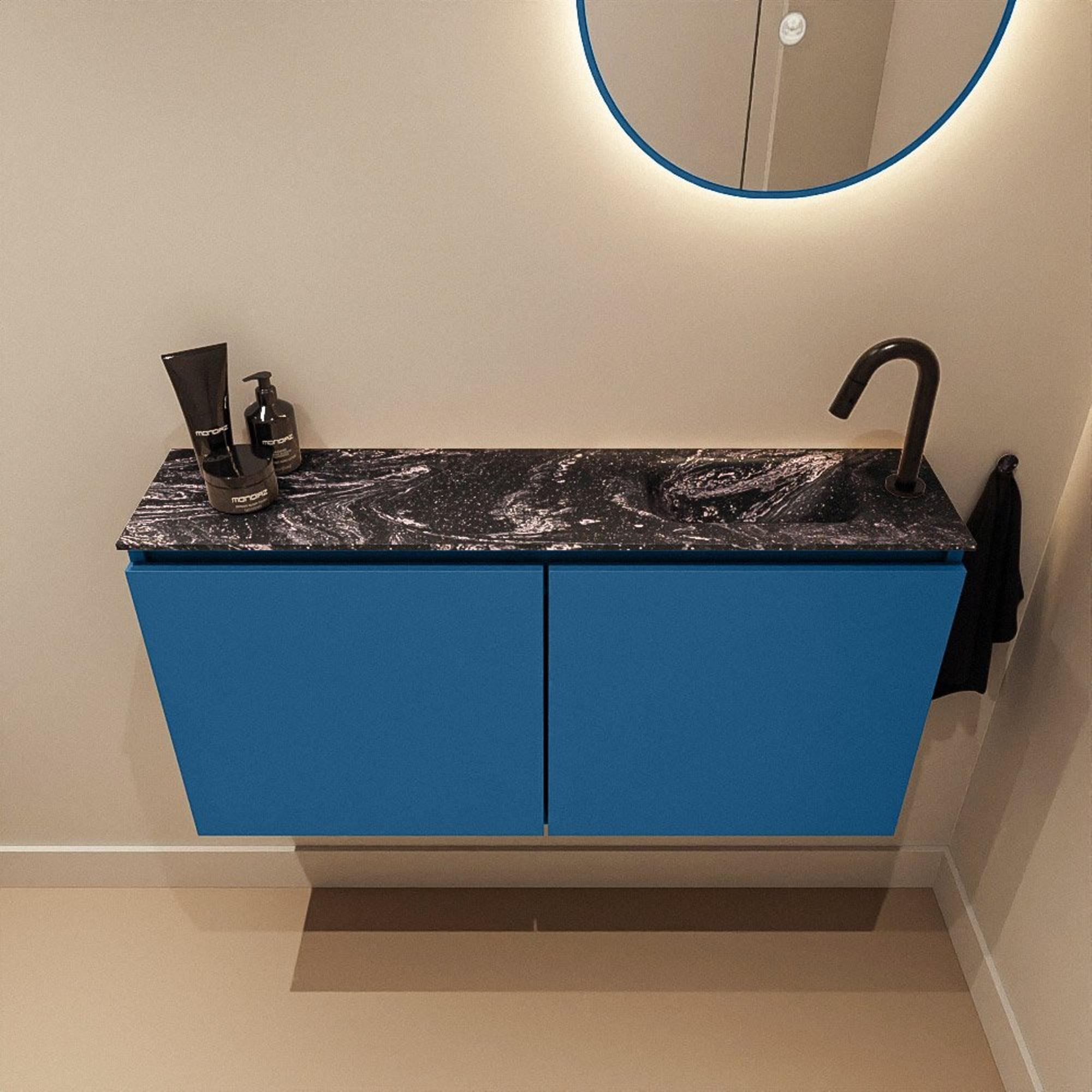 MONDIAZ TURE-DLUX Meuble de WC 100 cm Jeans. Lavabo EDEN Lava position à droite. Avec 1 trou de robinet.