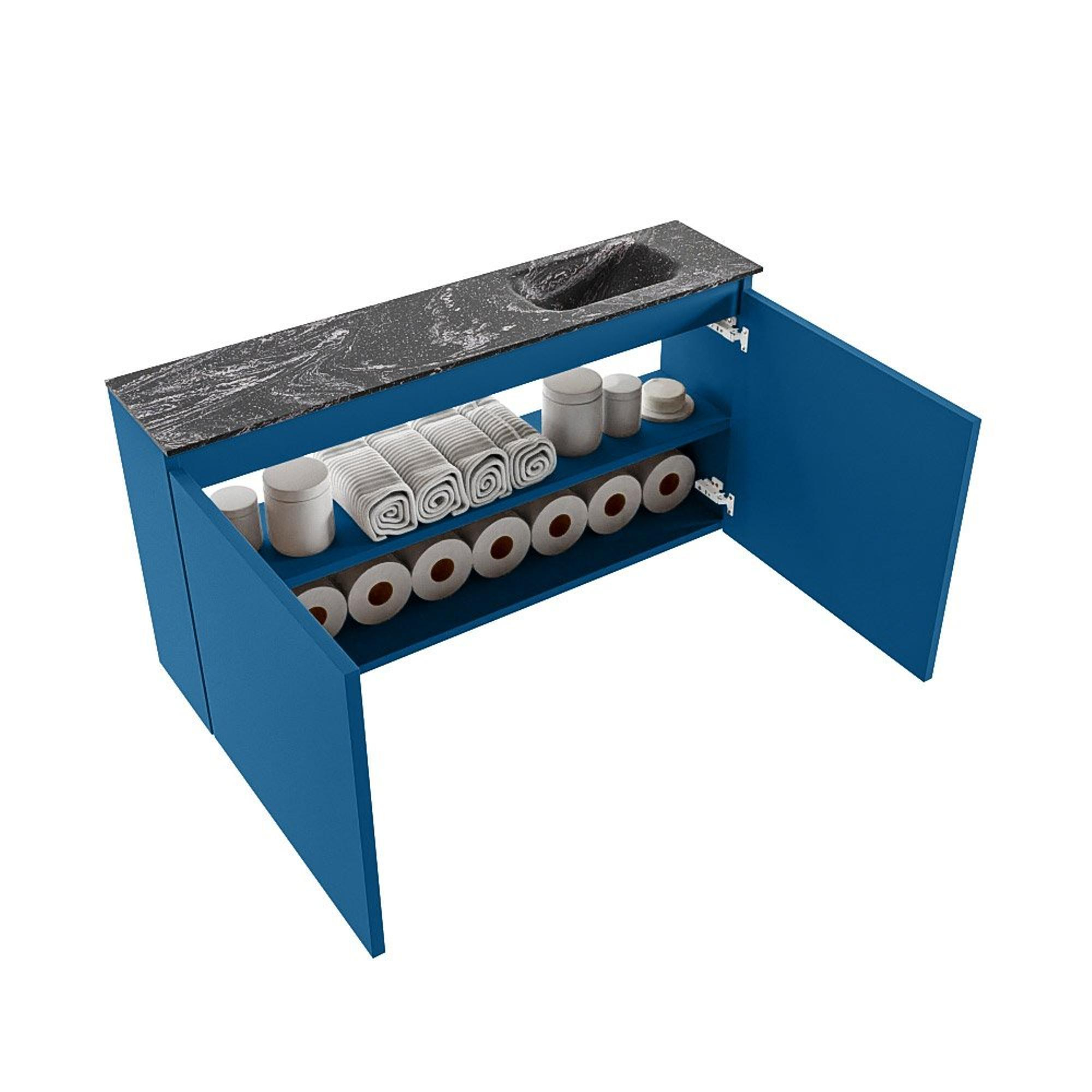 La couleur jeans du meuble bas donne immédiatement à vos toilettes une apparence moderne et chaleureuse. Il s’agit d’une teinte de bleu contemporaine qui se marie facilement aussi bien avec des carreaux muraux blancs qu’avec un effet béton ou des accents de bois. Le lavabo noir en Solid Surface dans la couleur Lava y ajoute une ambiance luxueuse, presque hôtelière. Le contraste entre le plan foncé et le meuble bas bleu crée un ensemble graphique et épuré qui devient réellement l’élément phare de vos toilettes. Si vous optez pour un robinet et des accessoires noirs ou en métal brossé, vous renforcez encore davantage ce look moderne. Vous préférez quelque chose de plus sobre ? Avec des robinets chromés ou en inox, l’ensemble obtient une apparence intemporelle et minimaliste. Vous pouvez ainsi créer facilement votre propre style avec la même base.