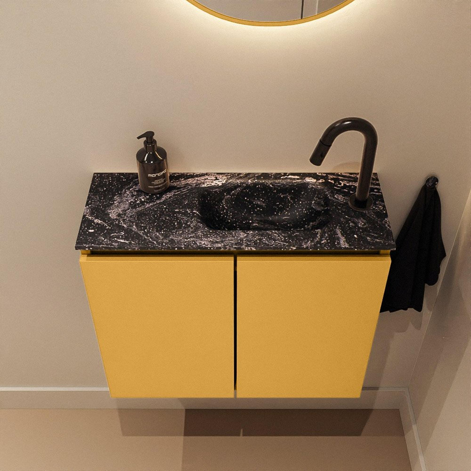 La couleur ocre moderne du meuble donne immédiatement du caractère et de la chaleur à vos toilettes. En combinaison avec le plan de lavabo Lava noir, on obtient un ensemble remarquable mais en même temps intemporel, qui s’intègre parfaitement dans un style moderne, industriel ou hôtel chic. L’exécution sans poignées renforce le look épuré et garantit un ensemble visuellement calme, même dans un petit espace. En optant pour cette combinaison de couleurs marquée, vous faites de vos toilettes plus qu’un simple endroit fonctionnel : elles deviennent une carte de visite de votre habitation, parfaitement en accord avec le reste de votre intérieur.