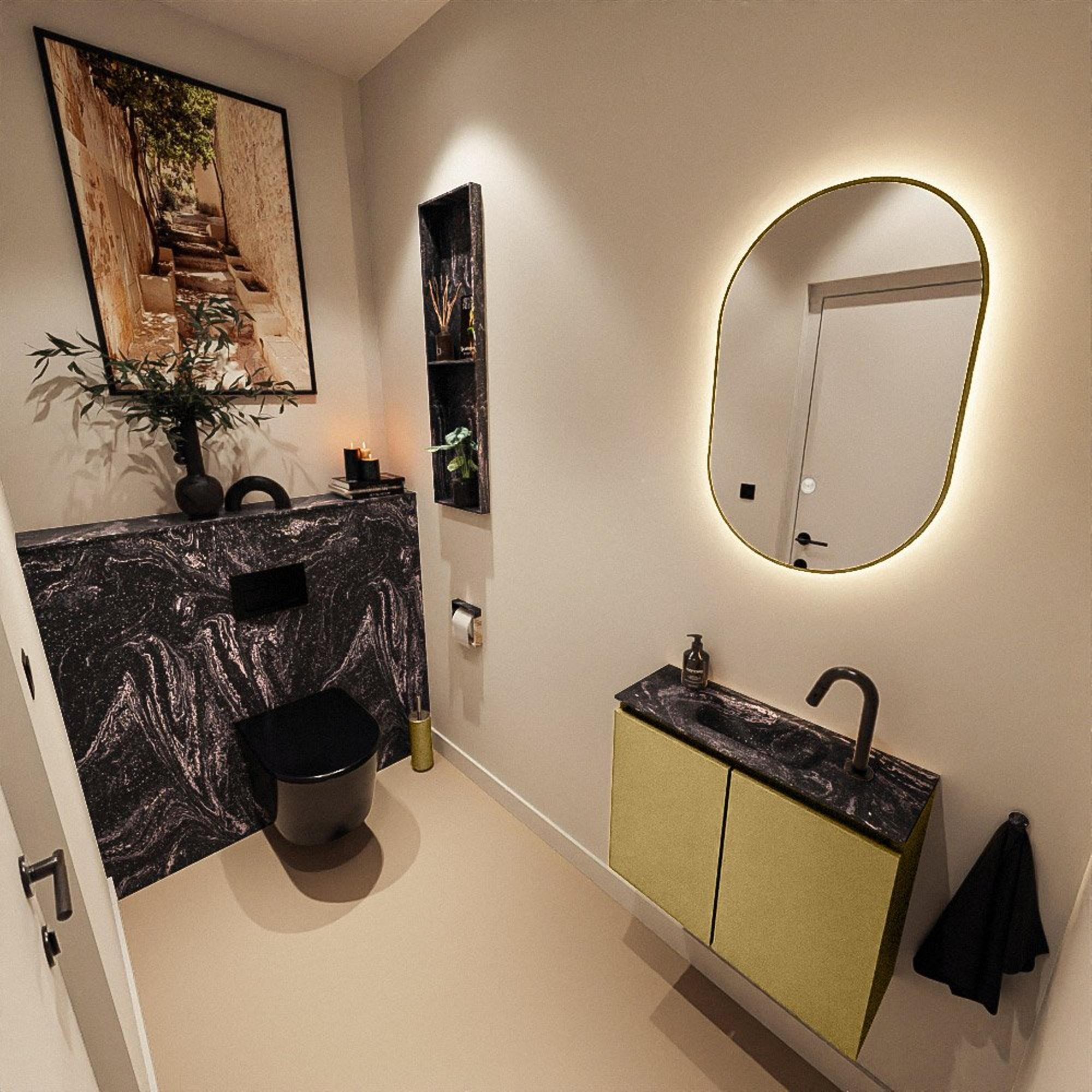 Ce set compact est idéal si vous recherchez une solution élégante pour une petite salle de bains, un espace WC ou une niche étroite, sans sacrifier l’aspect ni le confort. Grâce à ses dimensions peu profondes, le meuble s’intègre facilement dans les espaces compacts, tandis que la combinaison d’un meuble couleur or et d’un lavabo sombre et épuré crée immédiatement une atmosphère luxueuse. Grâce au lavabo intégré avec trou de robinet au milieu, il s’agit d’un choix pratique pour le lavage quotidien des mains et les rapides moments de rafraîchissement, aussi bien dans un WC moderne de nouvelle construction que dans un cityloft rénové ou une salle de bains de style hôtel. La conception est volontairement simple et fonctionnelle : suffisamment d’espace de rangement derrière les portes pour vos articles de toilette les plus utilisés, mais sans fioritures superflues. Vous optez ainsi pour un set qui non seulement est beau le jour de l’installation, mais reste également agréable à utiliser au quotidien et facile à entretenir.