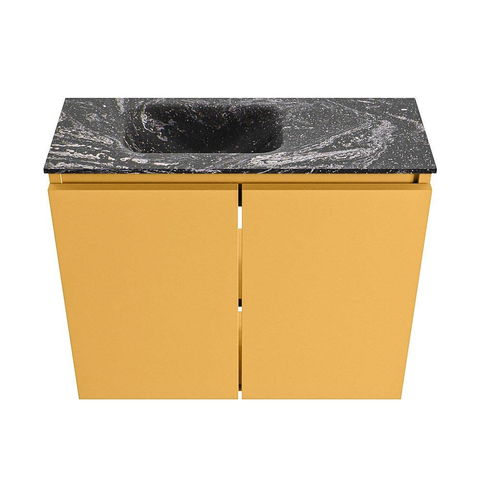 - Meuble de couleur ocre chaude combiné à un lavabo EDEN noir en Lava pour un look moderne