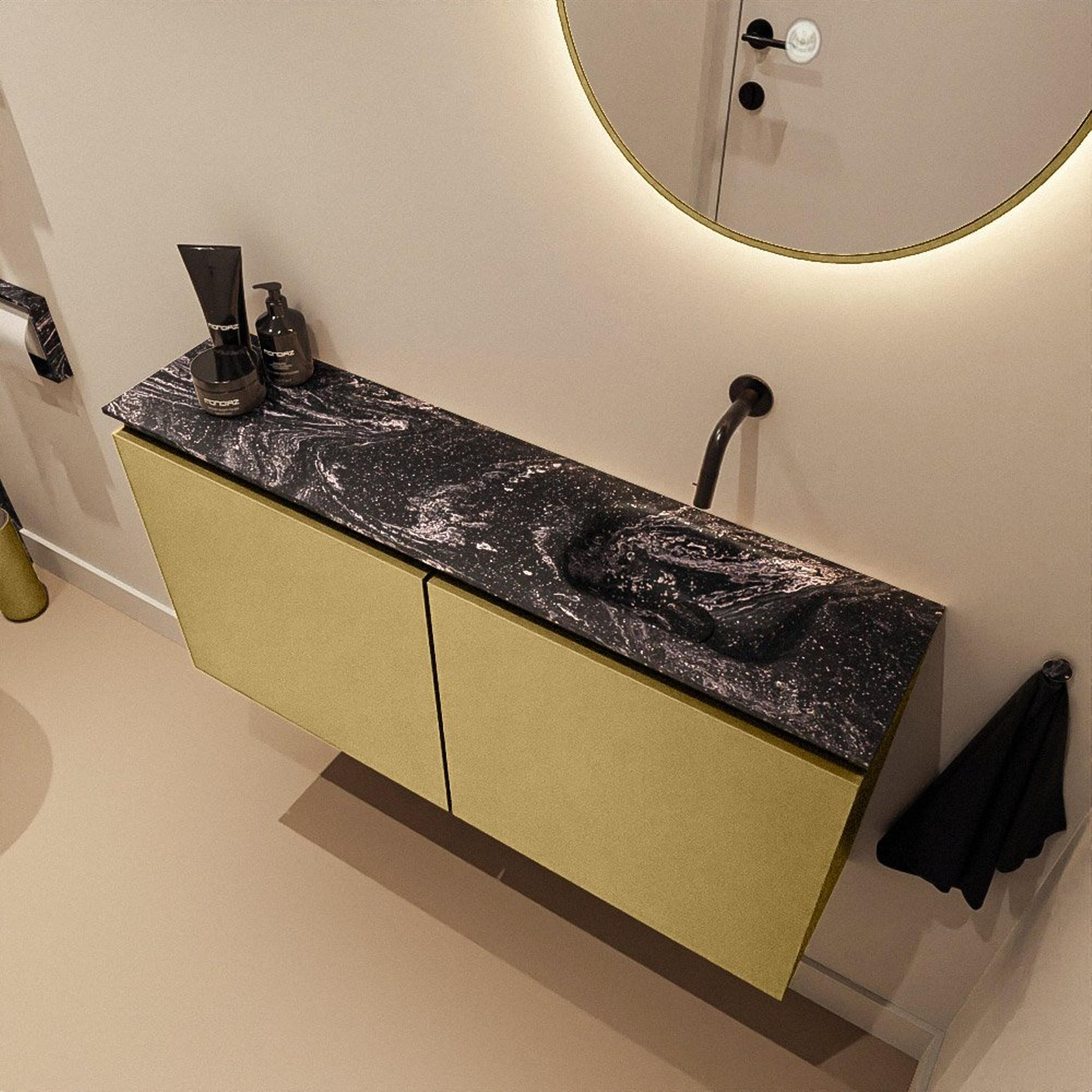 Design élégant : meuble couleur or avec lavabo noir