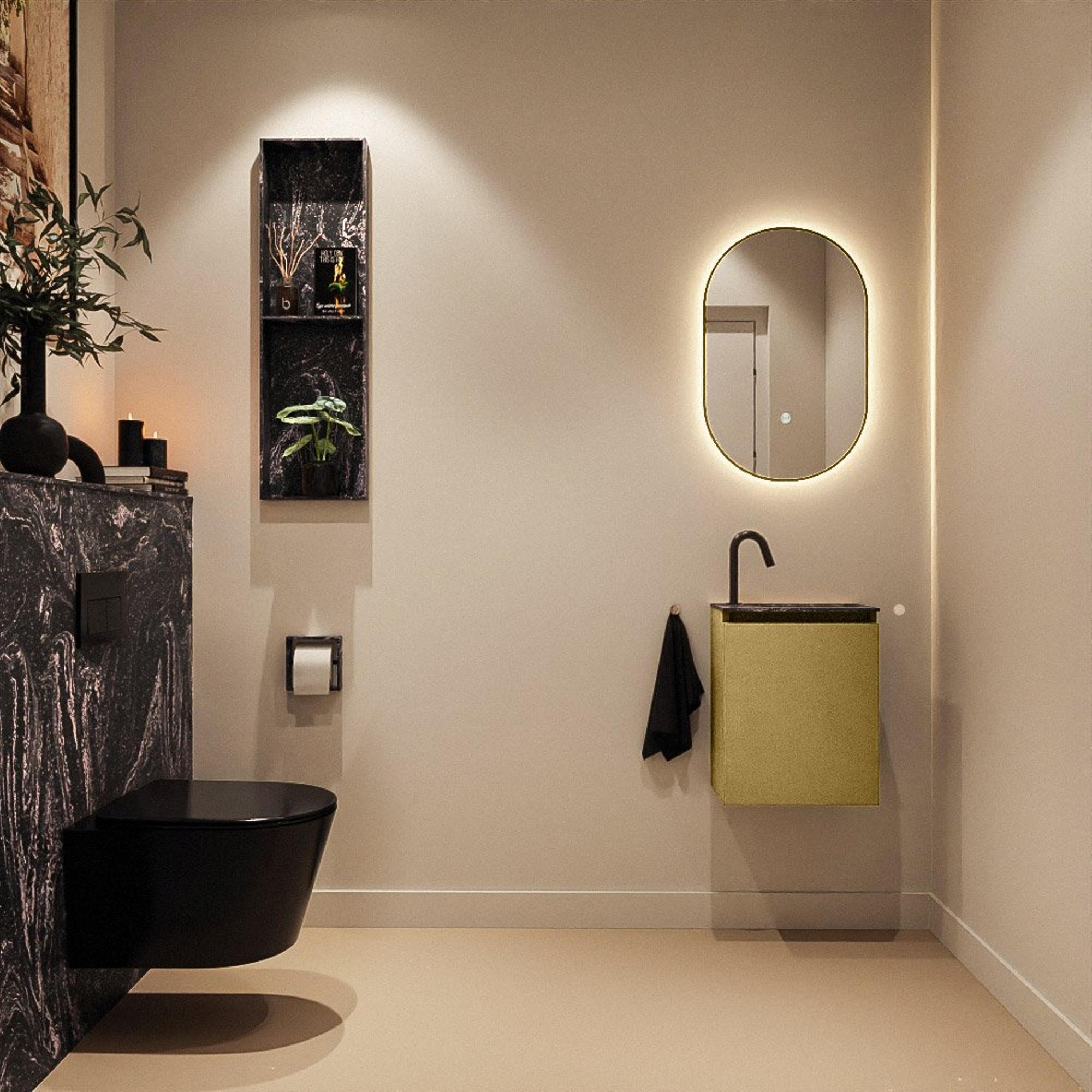 Le meuble doré dans la teinte Oro crée immédiatement une atmosphère luxueuse dans vos toilettes ou votre salle de bains. En combinaison avec le plan de lavabo noir en solid surface dans la couleur Lava, on obtient un look moderne et affirmé qui se marie parfaitement avec des robinets et des accessoires noirs. Cette combinaison de couleurs s’intègre parfaitement dans un intérieur moderne, mais aussi dans une salle de bains chaleureuse et conviviale avec, par exemple, des carreaux effet marbre ou béton. Comme le meuble est sans poignées, la façade reste épurée et minimaliste, ce qui est non seulement esthétique mais apporte aussi de la sérénité dans les petits espaces.