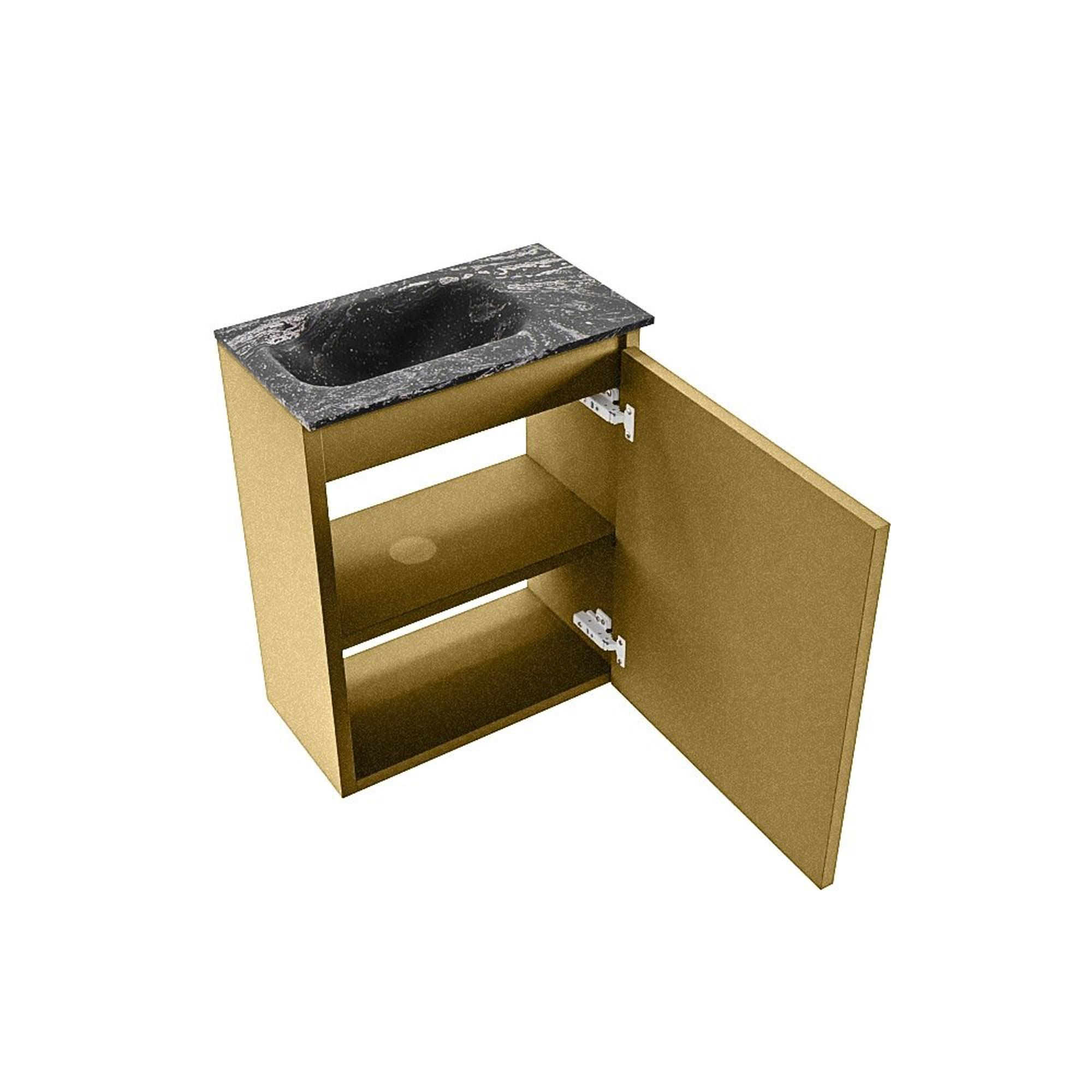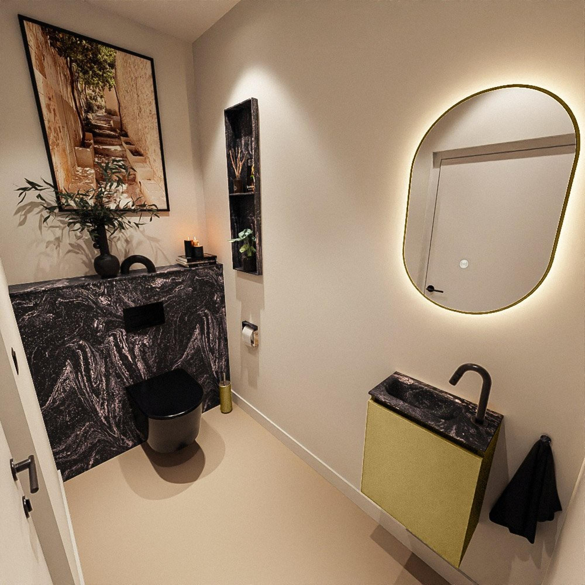 La combinaison du meuble doré en Oro avec le lavabo noir Lava attire immédiatement le regard. Ce mélange de couleurs s'accorde parfaitement avec des toilettes modernes et luxueuses et se marie bien avec des robinets noirs, des accessoires noirs ou d'autres accents dorés dans votre intérieur. Le contraste entre l'or chaud et le noir profond crée une ambiance chic, presque digne d'un hôtel, sans être criard. Si vous optez pour un robinet noir et des accessoires noirs, vous créez un ensemble épuré. Si vous combinez au contraire avec des robinets en laiton brossé ou de couleur or, vous renforcez encore davantage le look luxueux du meuble.