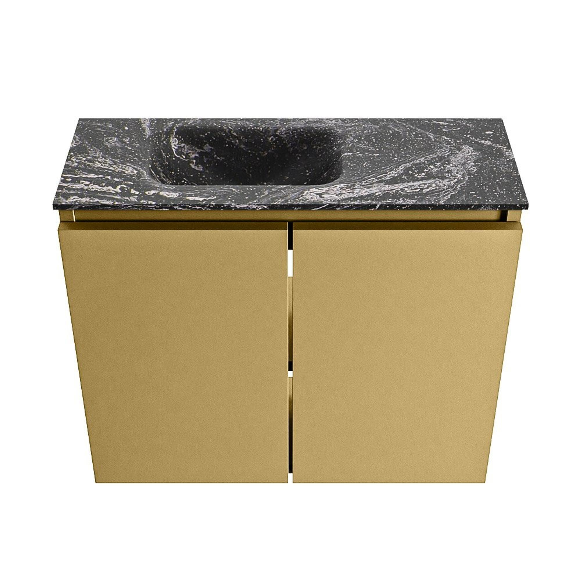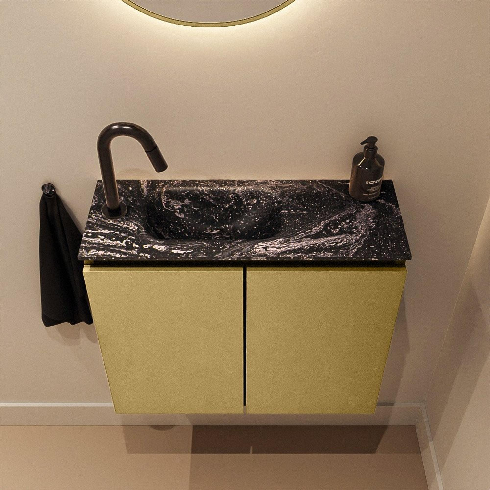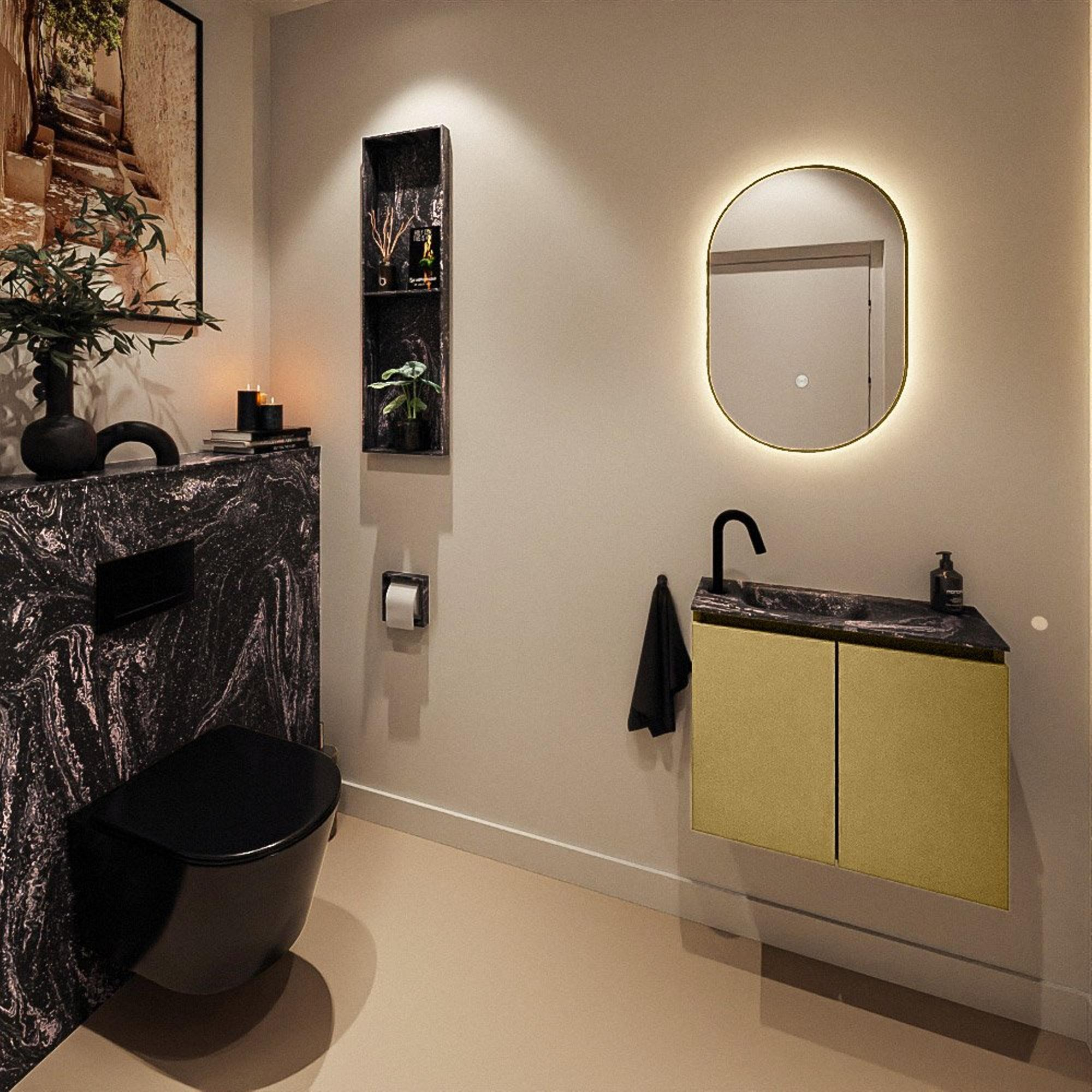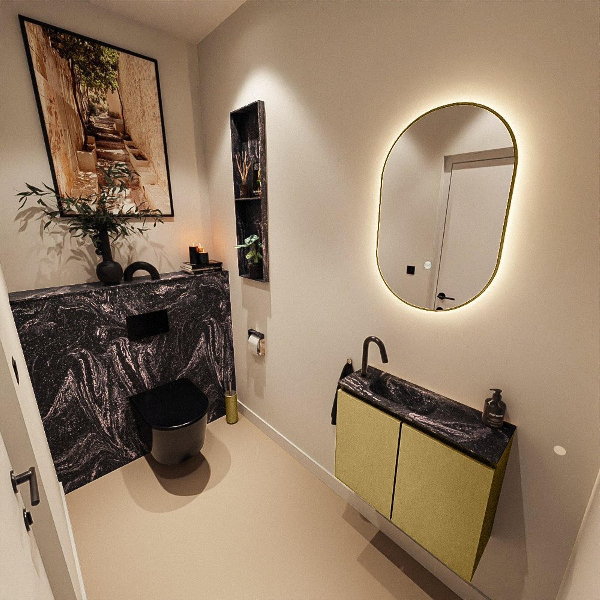La combinaison du meuble teinte or et du lavabo noir crée immédiatement une atmosphère d’hôtel de luxe dans vos toilettes. La façade lisse sans poignées et les lignes minimalistes assurent un effet moderne, tandis que la couleur chaude Oro donne à l’ensemble une allure chic. Le lavabo noir Lava crée un contraste puissant, faisant de l’ensemble un véritable accroche-regard au mur. C’est justement dans un petit espace comme les toilettes que l’on voit à quel point l’effet d’un meuble aussi élégant est important : avec un seul élément, vous donnez plus d’allure à toute la pièce. Combinez-le avec des accessoires noirs ou dorés et une robinetterie de lave-mains assortie pour un ensemble harmonieux.