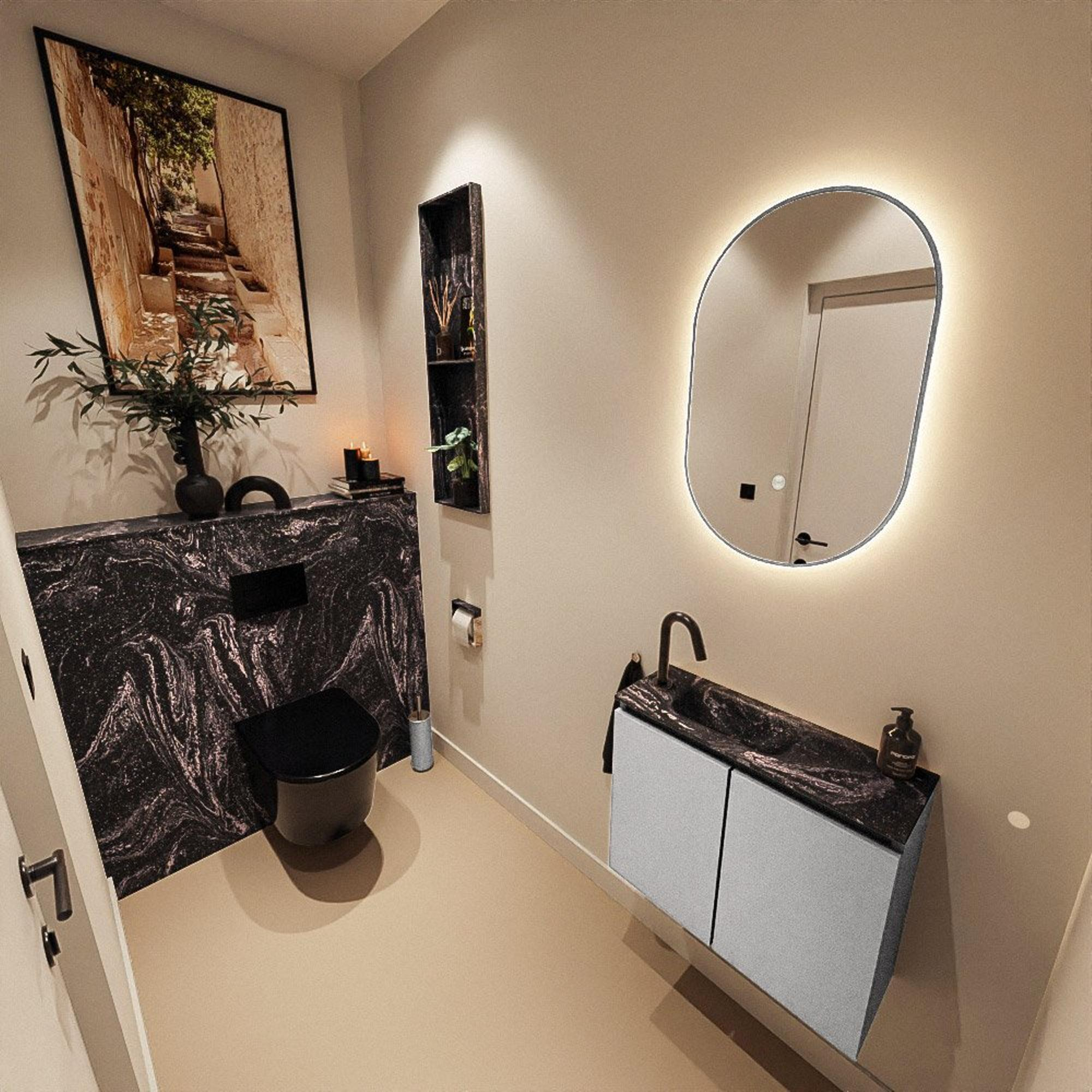 Avec une largeur de 60 cm et une faible profondeur de seulement 23 cm, ce meuble offre un bel équilibre entre confort d’utilisation et gain de place. Vous disposez d’une largeur suffisante pour vous laver les mains confortablement, tandis que le meuble empiète à peine sur l’espace. Il est donc particulièrement adapté à un petit local toilettes, une niche ou une petite salle de bains où chaque centimètre compte. La faible hauteur apporte en outre une sensation d’espace et donne l’illusion d’une pièce plus grande. La position gauche du lavabo avec trou de robinet rend l’ensemble particulièrement pratique le long d’un mur latéral ou lorsque la porte s’ouvre à proximité ; vous conservez ainsi un maximum de liberté de mouvement sans vous cogner.