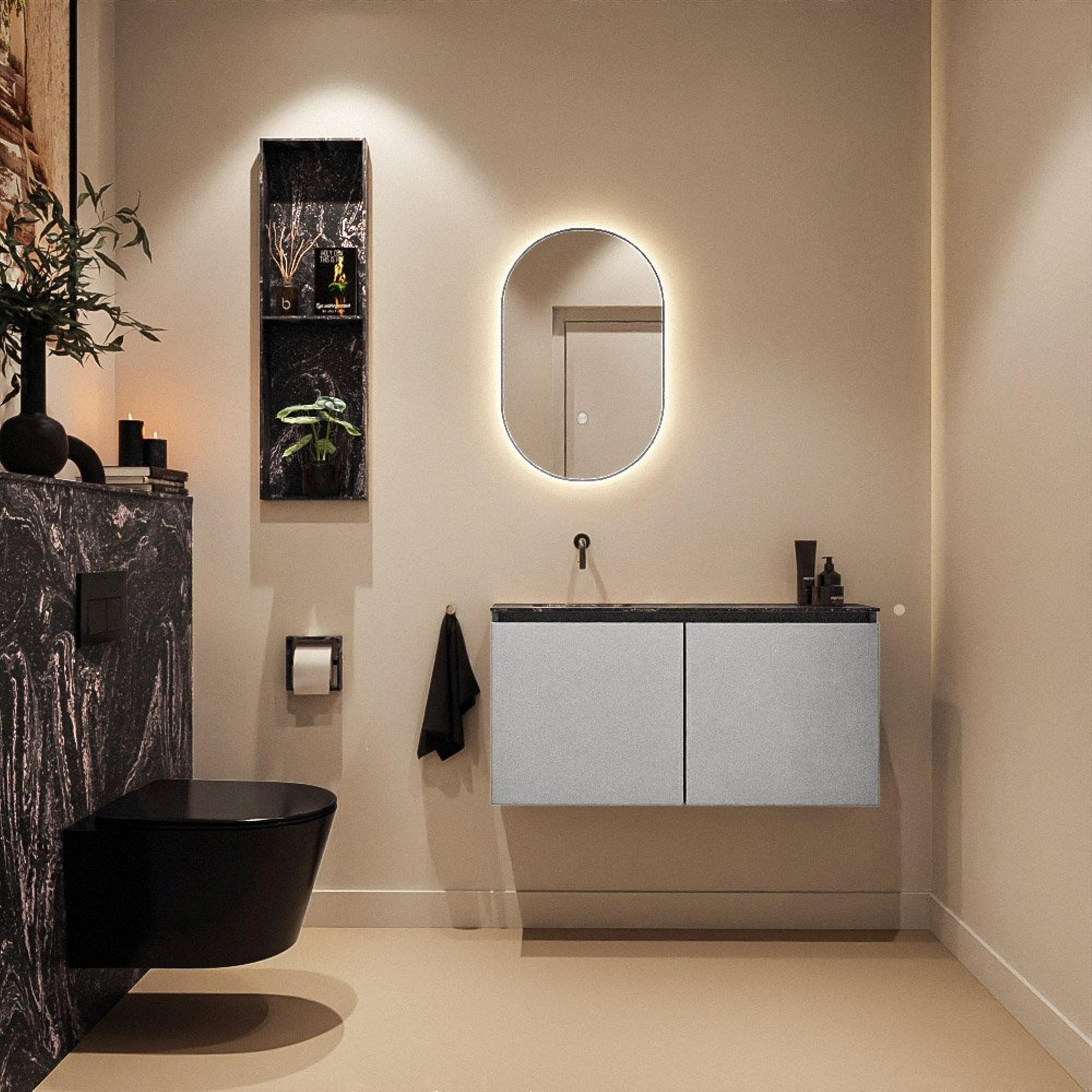 Ce meuble WC compact et luxueux est idéal si vous souhaitez aménager intelligemment un espace toilettes ou une petite salle de bains sans faire de concessions sur l’esthétique. Grâce à sa faible profondeur, il s’intègre parfaitement dans les espaces étroits ou les couloirs allongés, tout en offrant un lavabo à part entière pour se laver les mains confortablement. Les lignes modernes et épurées ainsi que la combinaison du meuble Plata avec un lavabo foncé créent une atmosphère chic digne d’un hôtel, qui s’accorde parfaitement avec un style de salle de bains moderne ou industriel. En plaçant le robinet à côté du lavabo sur le plan ou en sortie de mur, vous créez en outre un look minimaliste et conservez un ensemble calme et aéré. Vous optez ainsi avec ce meuble pour un mélange réfléchi de design, de fonctionnalité et de gain de place.