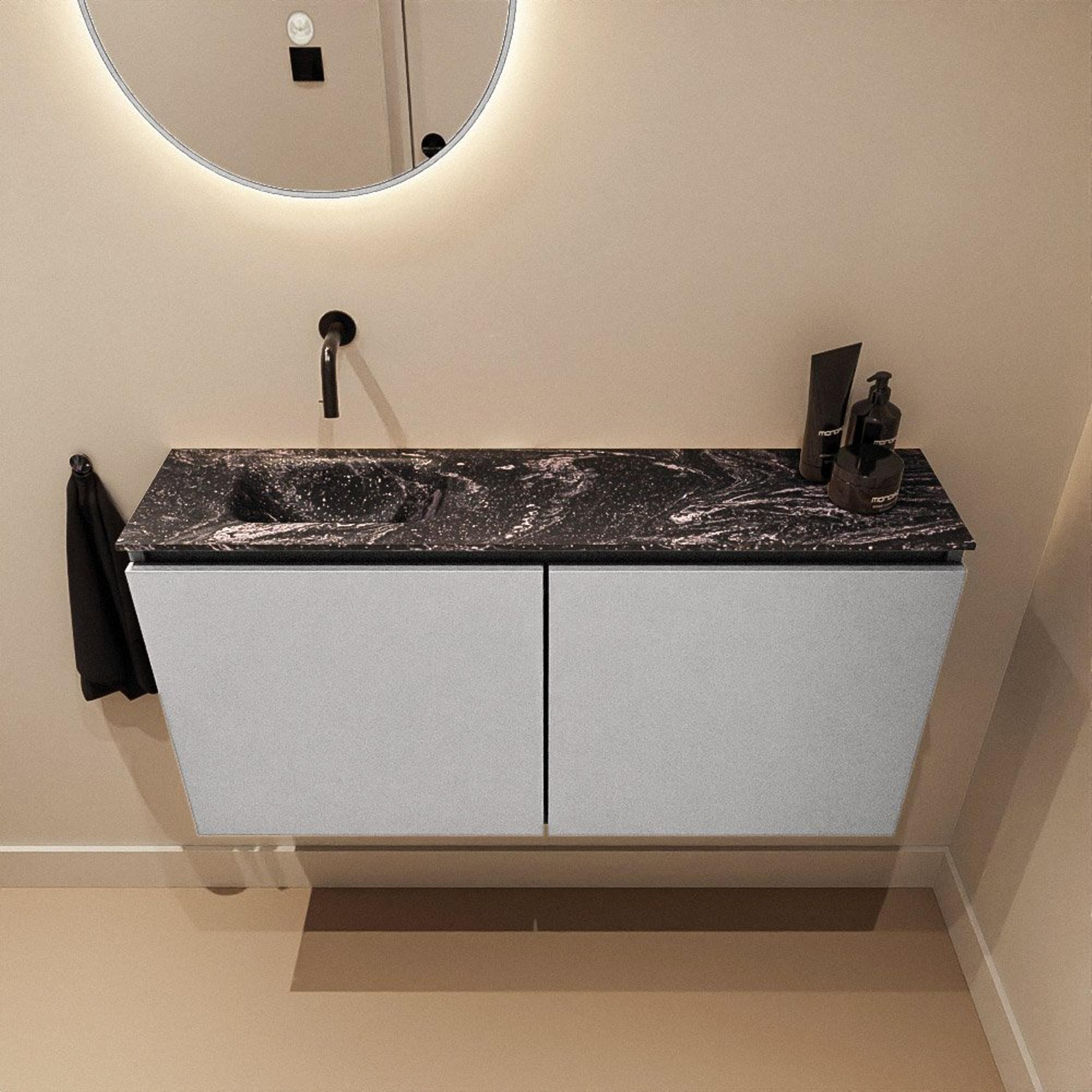 - Lavabo Eden en Lava positionné à gauche : pratique à l’usage et visuellement un élément de luxe accroche-regard.