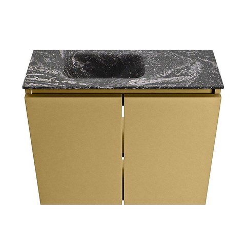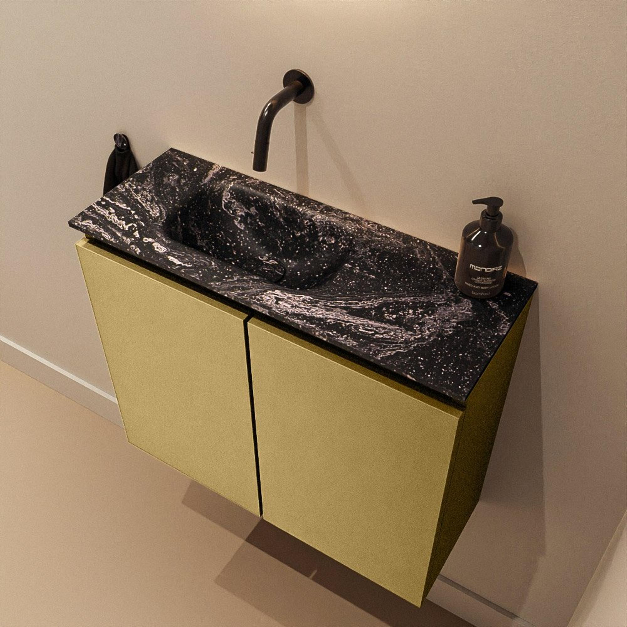 La combinaison du meuble couleur or et du lavabo noir Lava donne immédiatement à votre pièce une allure haut de gamme et design. Le caisson est réalisé en MDF, un matériau très utilisé pour les meubles de salle de bains en raison de sa finition soignée et de sa stabilité dimensionnelle. Le plan noir en solid surface et le lavabo Eden intégré offrent un aspect moderne et mat avec une subtile touche de luxe. La couleur Oro s’accorde parfaitement avec des robinets et accessoires noirs, mais se marie aussi très bien avec le laiton brossé ou d’autres métaux chaleureux. Vous posez ainsi facilement une base élégante pour un intérieur harmonieux dans vos toilettes ou votre salle de bains.