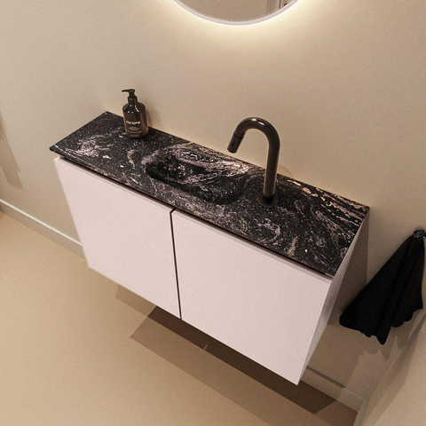 La teinte rose chaude du meuble donne immédiatement de l’ambiance à votre salle de bains et forme un contraste élégant avec le lavabo EDEN noir en couleur Lava. Cette combinaison convient parfaitement à une salle de bains moderne et design, mais fonctionne également très bien dans un intérieur scandinave ou dans un style doux et naturel. Le lavabo est placé au centre et doté d’un seul trou de robinet, ce qui vous permet de choisir facilement un mitigeur moderne qui renforce le style, par exemple en noir, en chrome ou en métal brossé. Le lavabo noir met clairement l’accent sur la zone de lavage et confère à l’ensemble une allure luxueuse et haut de gamme que l’on retrouve surtout dans les boutiques-hôtels.