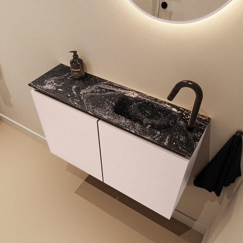 Le meuble est fabriqué en MDF et offre derrière ses deux portes un espace de rangement pratique pour les rouleaux de papier toilette, les serviettes invité et les produits d’entretien, soigneusement dissimulés. Le plan de lavabo Eden en solid surface couleur Lava présente des lignes épurées et un toucher solide et lisse, ce qui facilite le nettoyage. Comme il y a un seul trou de robinet et un seul lavabo, l’ensemble reste clair et comporte moins de joints et de rebords où la saleté peut s’accumuler. Le système softclose sur les portes garantit une fermeture douce et silencieuse, ce qui procure non seulement une sensation de luxe, mais contribue aussi à prolonger la durée de vie du meuble. Grâce aux propriétés antibactériennes, il s’agit en outre d’un choix hygiénique pour une pièce fortement sollicitée.