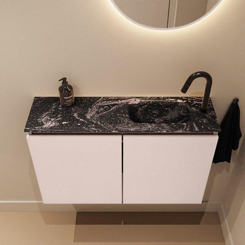 Avec une profondeur de seulement 23 cm, ce meuble est spécialement conçu pour les toilettes et les petites salles de bains où chaque centimètre compte. La largeur de 80 cm vous offre malgré tout un lavabo généreux et suffisamment d’espace pour vous laver les mains confortablement, sans devoir vous contorsionner. Comme le meuble est peu profond, le passage reste large et la pièce semble immédiatement plus grande et plus apaisante. La position du trou de robinet à droite est une solution pratique si votre arrivée d’eau se trouve de ce côté ou si la porte s’ouvre de l’autre côté. Vous évitez ainsi les lignes qui se heurtent et créez un agencement logique et sûr dans un espace souvent déjà exigu.