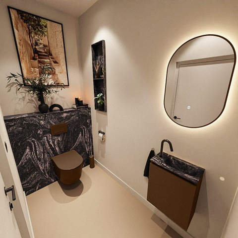 La couleur chaude Rust du meuble offre une apparence naturelle, presque boisée, qui apporte immédiatement de l’ambiance à vos toilettes ou à votre salle de bains. Associée au lavabo Eden noir dans la couleur Lava, elle crée un contraste puissant qui rappelle les hôtels design de luxe. La façade lisse et sans poignées assure un aspect apaisant et minimaliste sans interruptions, ce qui donne au meuble une allure luxueuse malgré son format compact. Ce style moderne se combine facilement avec des robinets noirs, des accessoires noirs ou, au contraire, avec des tons terre doux pour un ensemble calme et équilibré.
