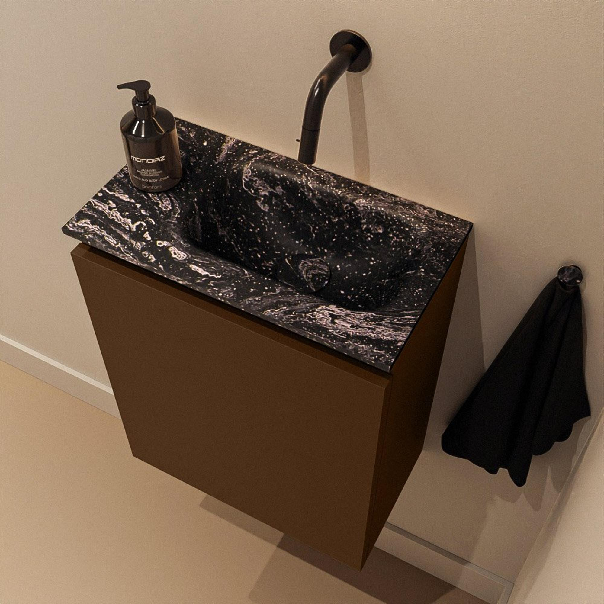 Le meuble de couleur Rust et le lavabo Eden en Lava (noir) forment ensemble une combinaison puissante et contemporaine. La teinte brune chaleureuse du meuble crée immédiatement une atmosphère, tandis que le lavabo en solid surface noir assure un aspect luxueux et design. Cela fait de ce meuble un bel accord avec des robinets noirs, des accessoires noirs mats ou des accents industriels tels que l’acier et les carreaux effet béton. La finition épurée sans poignées renforce le style moderne et garantit un ensemble calme et ordonné. Vous créez ainsi en une seule fois un look cohérent dans vos toilettes ou votre petite salle de bains, sans devoir combiner à l’infini.