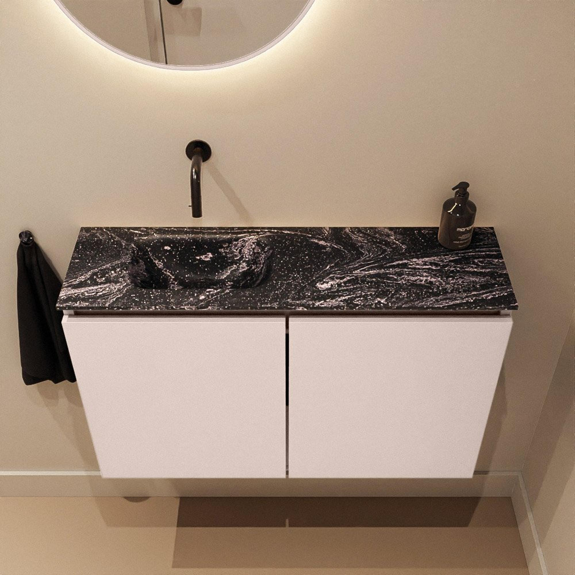 La couleur Rosee confère à votre espace une allure douce et contemporaine et se marie à merveille avec des toilettes blanches ainsi qu'avec des robinets noirs ou en laiton. En combinaison avec le plan vasque EDEN noir en Lava, il se crée un contraste chic qui apporte instantanément une touche design, même dans un petit WC. Les façades sans poignées renforcent l'aspect calme et minimaliste et garantissent un ensemble à l'apparence épurée et ordonnée. Grâce à son design moderne, ce meuble s'accorde parfaitement avec un style de salle de bains scandinave, hôtel chic ou d'inspiration industrielle. Avec les bons accessoires - pensez à un beau miroir et à un robinet mural élancé - vous en faites facilement une véritable carte de visite de votre habitation.