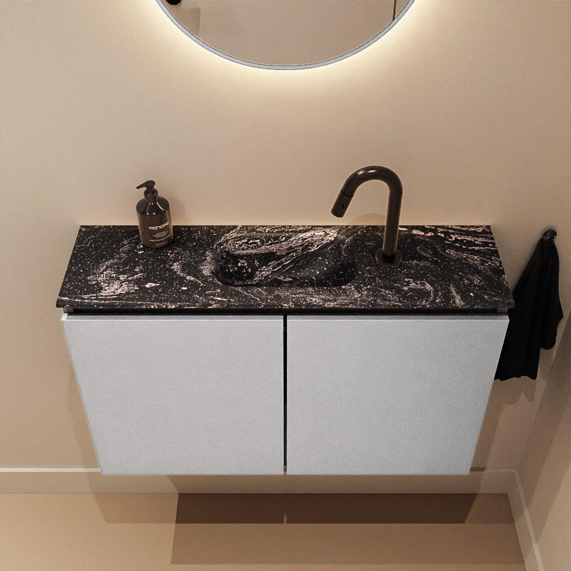 La couleur grise moderne du meuble constitue une belle base neutre qui se marie parfaitement avec une grande variété de couleurs de carrelage et de robinetterie. Le lavabo Eden noir dans la couleur Lava offre un contraste puissant et un look luxueux et design que l’on trouve habituellement dans les salles de bains haut de gamme. La façade épurée, sans poignées, s’inscrit dans un intérieur minimaliste et permet à l’ensemble de conserver un aspect sobre, même si l’espace est réduit. Le plateau et la cuve noirs en Solid Surface offrent une finition mate raffinée qui s’accorde parfaitement avec des choix tendance tels que les robinets noirs, les accessoires et les profilés de douche. Vous créez ainsi un espace toilettes cohérent et moderne qui restera actuel pendant de nombreuses années.