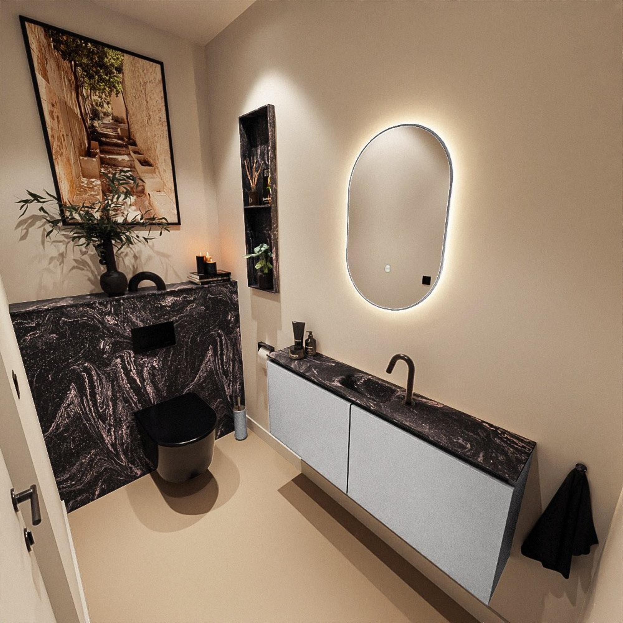 La couleur moderne Plata du meuble forme un beau contraste avec le plan de lavabo sombre et épuré en finition Lava. Ensemble, ils créent une atmosphère luxueuse façon hôtel, sans que l’ensemble ne devienne dominant. Les façades sans poignées renforcent le look minimaliste et créent une apparence calme et ordonnée, particulièrement appréciable dans un petit espace toilettes. Le lavabo possède un trou de robinet au centre, ce qui vous permet de choisir facilement un robinet de lave-mains assorti qui complétera votre style. Que vous optiez pour le noir, le chrome ou le métal brossé, grâce à la combinaison de couleurs neutres, ce meuble se marie aisément avec différents coloris de robinets et d’accessoires.
