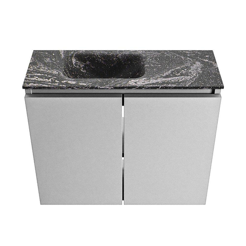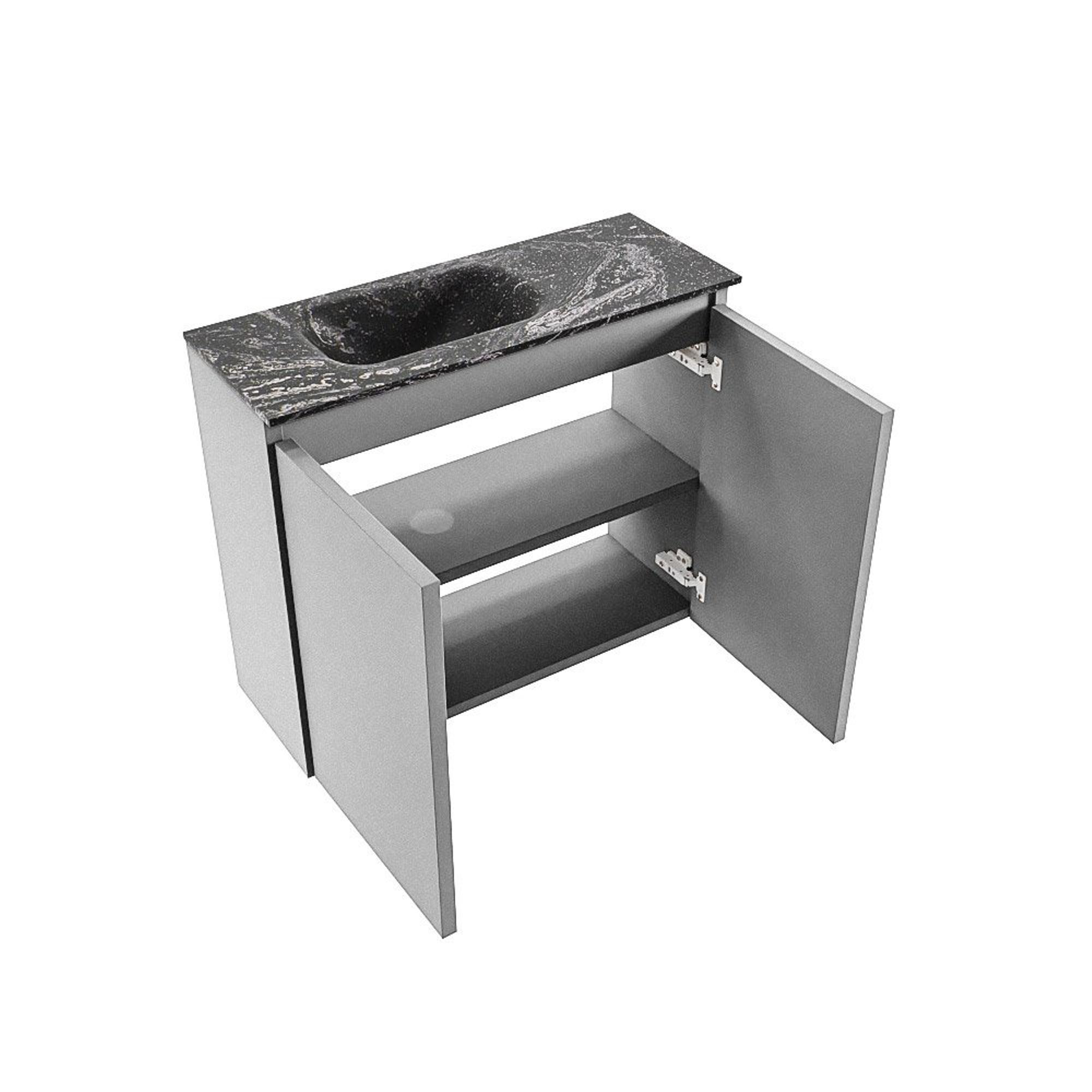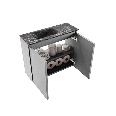 La combinaison de la couleur grise Plata avec le plan en Solid Surface noir et le lavabo Eden en Lava confère un aspect luxueux et architectural. La façade sans poignée renforce le look minimaliste et permet au meuble de s'intégrer discrètement dans le jeu de lignes de votre espace. Avec une largeur de 60 cm et une profondeur de seulement 23 cm, l'ensemble paraît élancé et léger, sans devenir trop présent dans vos toilettes ou votre petite salle de bains. Le lavabo est positionné à gauche, ce qui rend le meuble particulièrement adapté aux situations où vous avez, par exemple, besoin de plus d'espace de mouvement à droite ou d'un crochet porte-serviette. Vous créez ainsi un aménagement moderne et bien pensé, cohérent jusque dans les moindres détails.