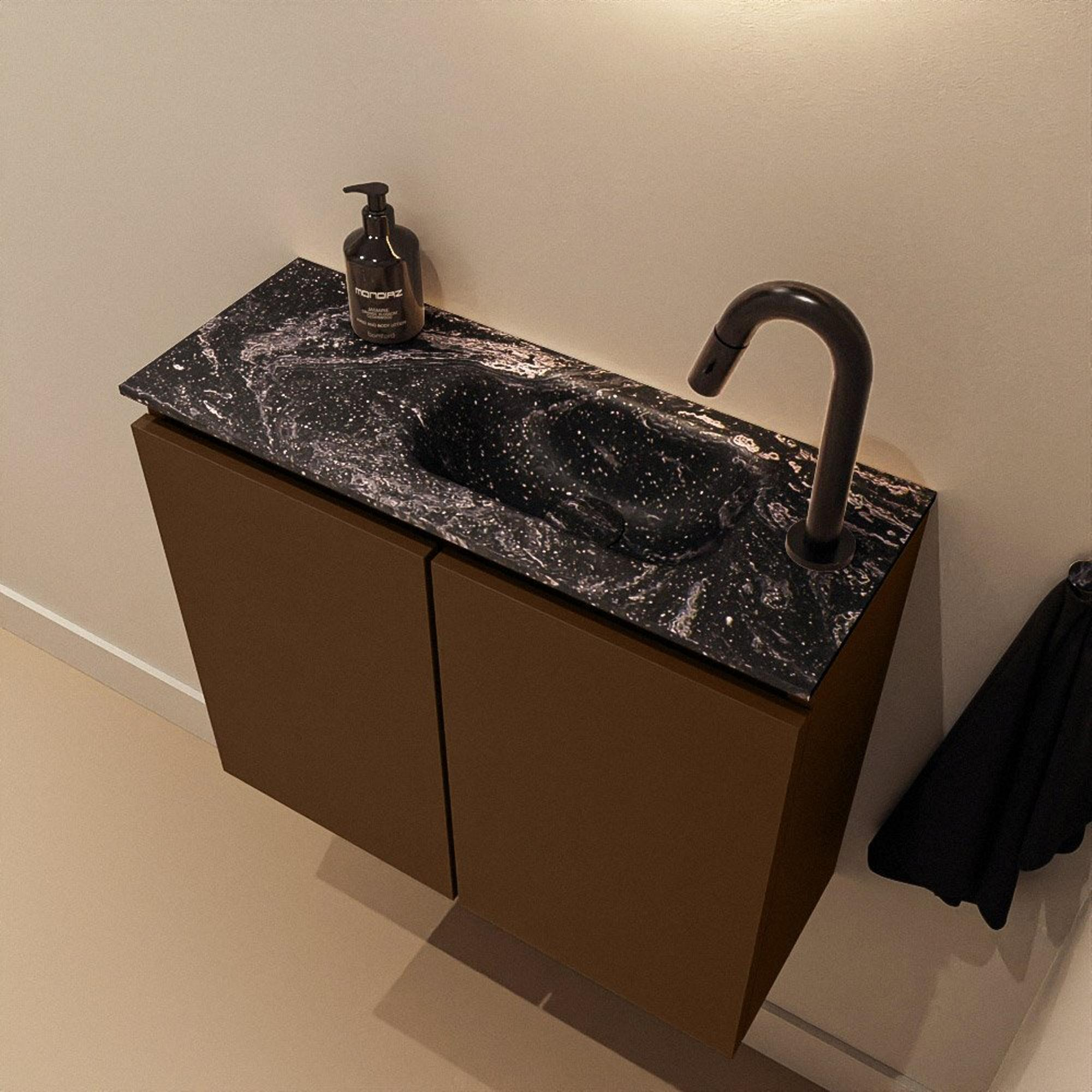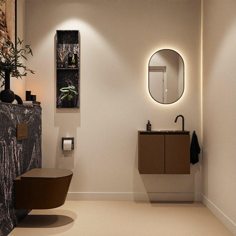 La combinaison de la teinte bois rustique et du lavabo noir Lava donne immédiatement à vos toilettes un aspect moderne et luxueux. Le plan de lavabo en Solid Surface, d’un noir profond, offre un rendu épuré et minimaliste, tandis que le meuble en couleur Rust apporte chaleur et atmosphère. Grâce au design sans poignées, l’ensemble reste calme et linéaire : pas de poignées saillantes, mais une façade plane qui s’intègre parfaitement dans un intérieur moderne ou scandinave. Le lavabo a été spécialement conçu en variante Eden, avec un design subtil et plat qui ne paraît pas massif dans un petit espace. Si vous optez pour un robinet noir et des accessoires noirs, vous créez facilement une ambiance haut de gamme, façon hôtel, dans des toilettes par ailleurs modestes.