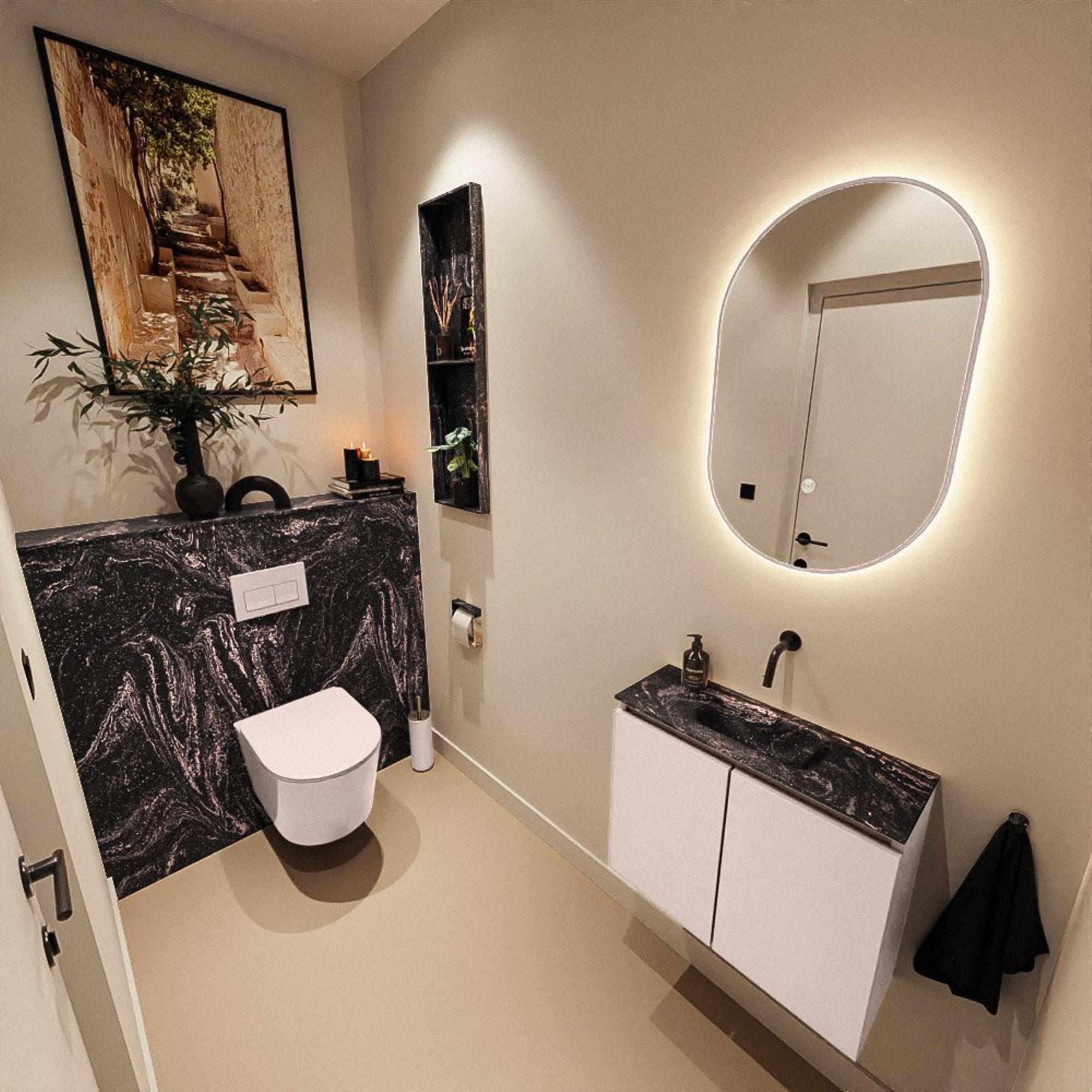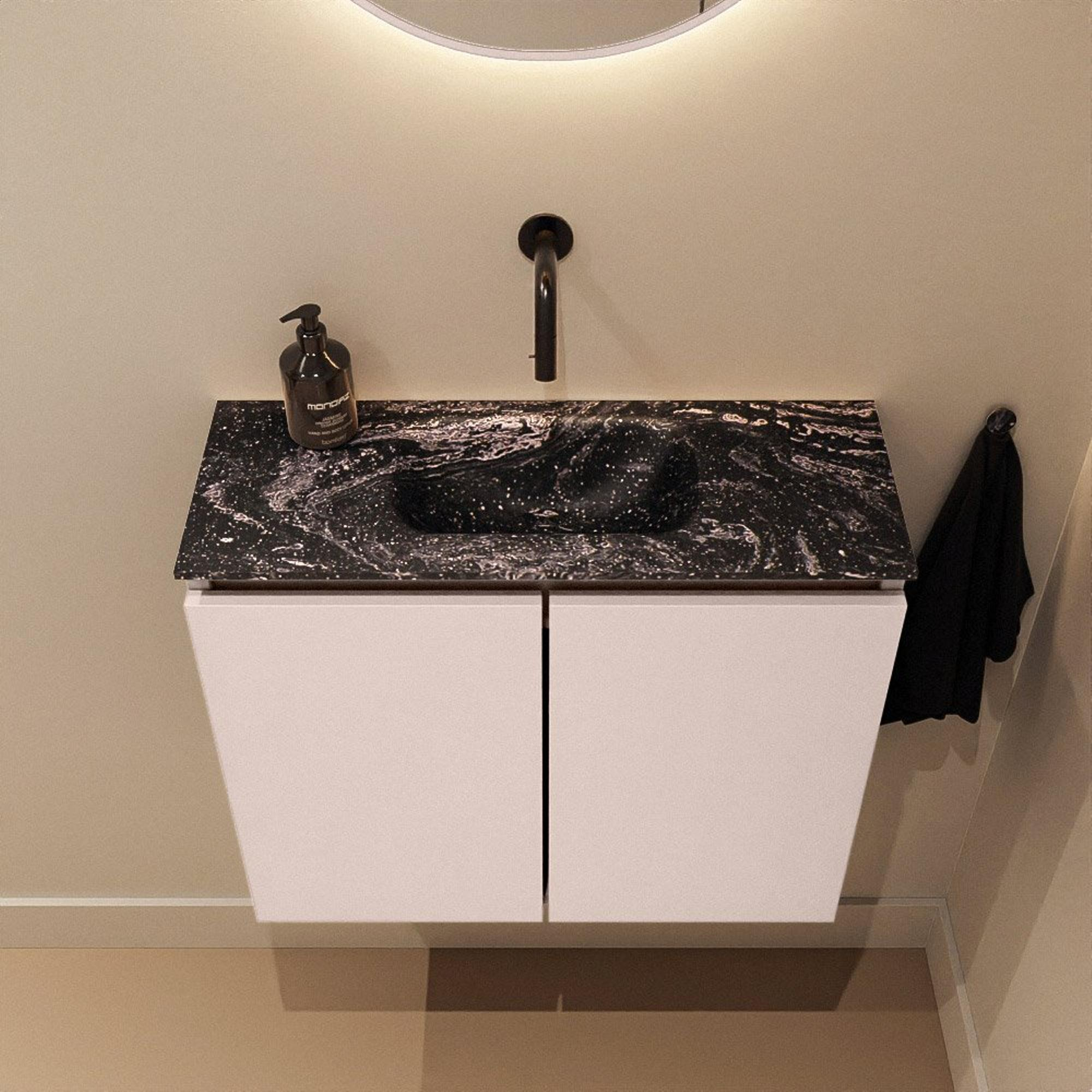 Avec une largeur de 60 cm, une hauteur de 50 cm et une profondeur de seulement 23 cm, ce meuble est parfait pour les petites toilettes et les salles de bains étroites. La faible profondeur évite que le meuble ne ressorte de manière gênante, tout en offrant suffisamment d’espace de dépose autour du lavabo. Les deux portes offrent un espace de rangement pratique pour, par exemple, les rouleaux de papier toilette, les produits d’entretien ou les serviettes invités, afin que vos toilettes restent toujours bien rangées. Comme le lavabo est positionné au centre, l’ensemble paraît symétrique et apaisant, ce qui apporte davantage d’équilibre et de sensation d’espace, en particulier dans les petites pièces.