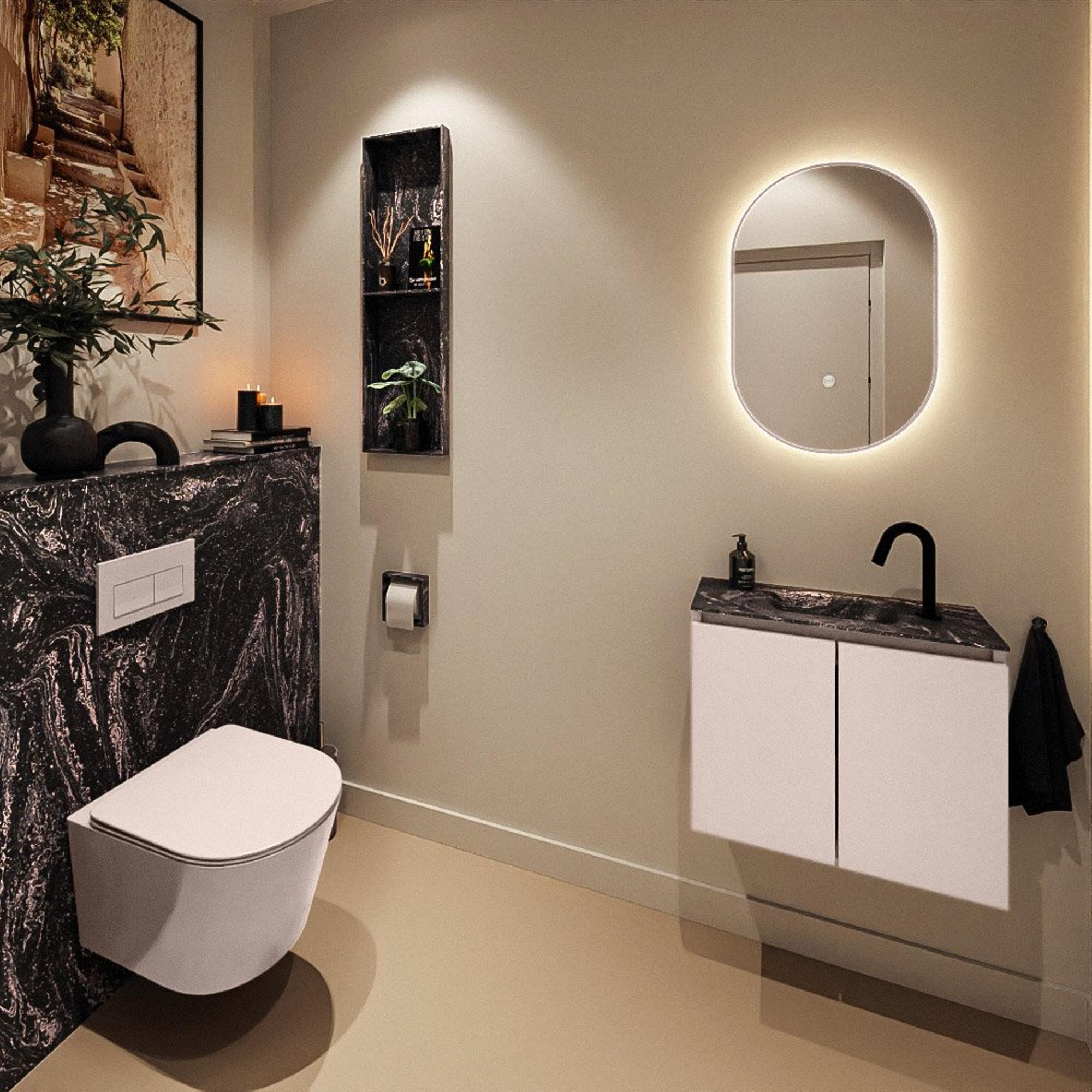Ce meuble de toilette compact est idéal si vous souhaitez offrir à vos toilettes ou à votre petite salle de bains une mise à niveau à la fois élégante et pratique, sans empiéter sur l’espace de circulation. Grâce à sa faible profondeur, il s’intègre parfaitement dans les espaces étroits, tout en offrant suffisamment de place pour se laver confortablement les mains. La combinaison d’une couleur de meuble douce et moderne avec un lavabo aux lignes épurées et sombres crée une apparence luxueuse qui s’harmonise aisément avec un style d’intérieur moderne. Ce meuble convient particulièrement à ceux qui apprécient un look minimaliste et ordonné et qui préfèrent choisir un ensemble dont le design et les dimensions sont déjà parfaitement coordonnés. Si vous recherchez une solution compacte avec des matériaux de haute qualité et une conception bien pensée, il s’agit d’un choix judicieux aussi bien pour les toilettes que pour la petite salle de bains.