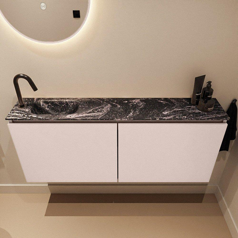 Avec une profondeur de seulement 23 cm, ce meuble est parfait pour les WC étroits et les petites salles de bains, sans donner l’impression de sacrifier le confort. La largeur de 120 cm crée au contraire une ligne horizontale luxueuse le long du mur, ce qui agrandit visuellement l’espace. Les deux portes offrent suffisamment de rangement pour le papier toilette, les serviettes invité et les produits d’entretien, afin que tout reste bien à l’abri des regards et que vos toilettes aient toujours un aspect ordonné. Grâce aux façades sans poignées, l’ensemble reste épuré et minimaliste, idéal si vous aimez une base moderne et apaisante que vous pouvez ensuite personnaliser avec des accessoires selon vos goûts.