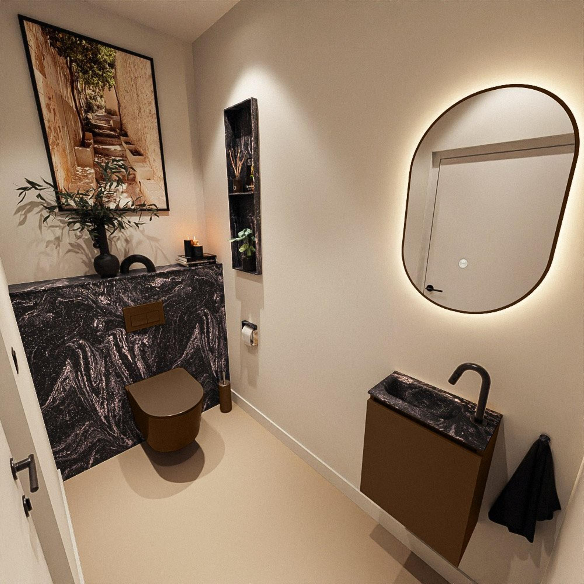 Le meuble de couleur Rust offre une apparence chaleureuse et naturelle avec une touche moderne, parfaite si vous souhaitez créer un style hôtel chic ou contemporain. Le plan de lavabo en Solid Surface de couleur Lava (noir) forme un contraste robuste avec le meuble brun et s’accorde parfaitement avec des robinets et accessoires noirs. Grâce à la façade sans poignées, l’ensemble reste épuré et minimaliste ; pas de poignées saillantes qui alourdissent l’espace ou sur lesquelles vous risquez de vous cogner. Cette combinaison s’harmonise facilement avec des carreaux modernes, des sols effet béton ou, au contraire, des murs clairs et tranquilles. Vous créez ainsi avec un seul meuble une véritable déclaration de style dans un espace souvent oublié : les toilettes.