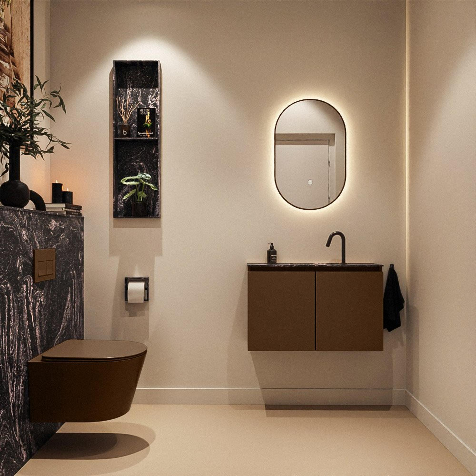La combinaison d’un meuble en finition Rust et d’un lavabo noir en Lava donne immédiatement à tes toilettes une ambiance chaleureuse et moderne. La teinte bois brune apporte chaleur et caractère, tandis que le plan en Solid Surface noir offre un rendu épuré et chic. Ce mélange de matériaux et de couleurs confère un véritable aspect design et fait de ce meuble un élément phare, même dans un petit espace. La finition sans poignées renforce le caractère minimaliste et assure un ensemble calme et ordonné. Combine-le avec un robinet assorti noir ou justement en laiton et des accessoires coordonnés pour affirmer ton propre style et parfaire l’esthétique de ton espace WC.