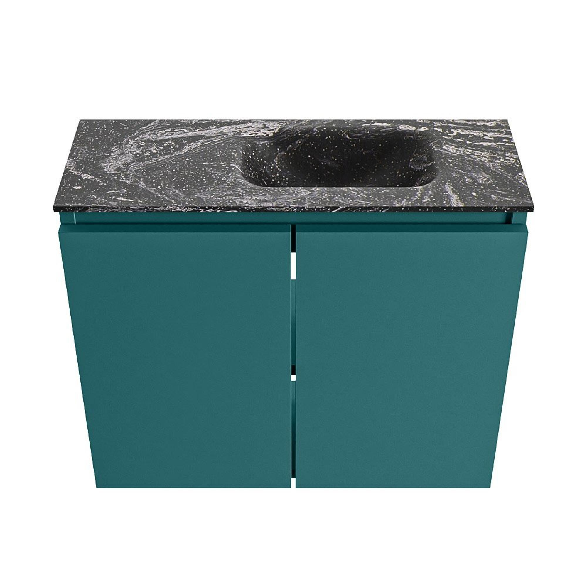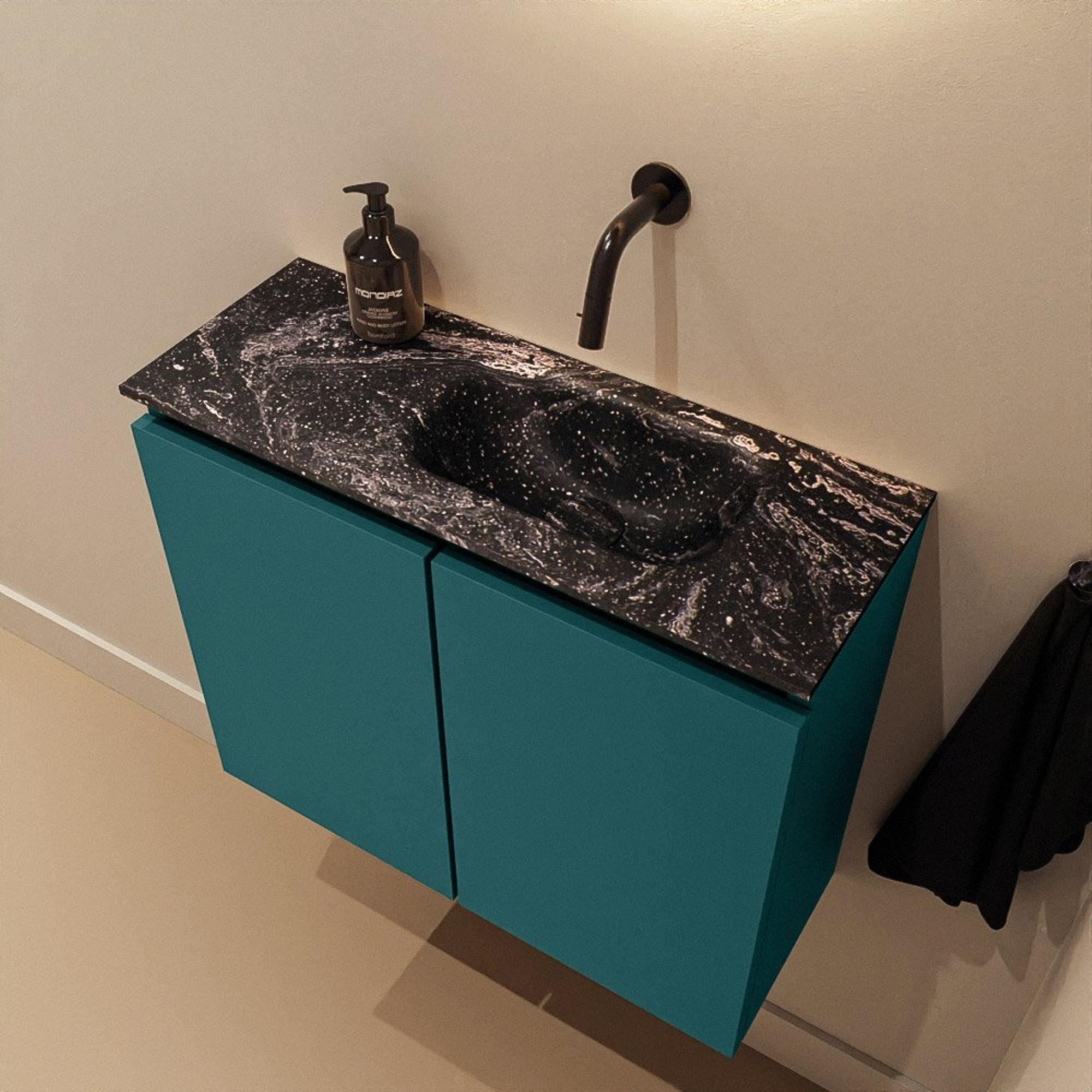 La couleur de meuble Smag, une teinte verte moderne, donne immédiatement à vos toilettes une base contemporaine et chaleureuse. En combinaison avec le plan vasque noir et le lavabo en solid surface couleur Lava, il en résulte un contraste chic qui s’harmonise parfaitement avec les salles de bains modernes et design. Ces couleurs se marient très bien avec des robinets noirs, des accessoires noir mat ou au contraire du laiton brossé pour une ambiance chaleureuse de type hôtel. En choisissant ce meuble, vous posez d’un seul coup une base de style forte : le reste de l’aménagement de vos toilettes – comme le carrelage, le miroir et les accessoires – se coordonne facilement à celui-ci pour un ensemble harmonieux.