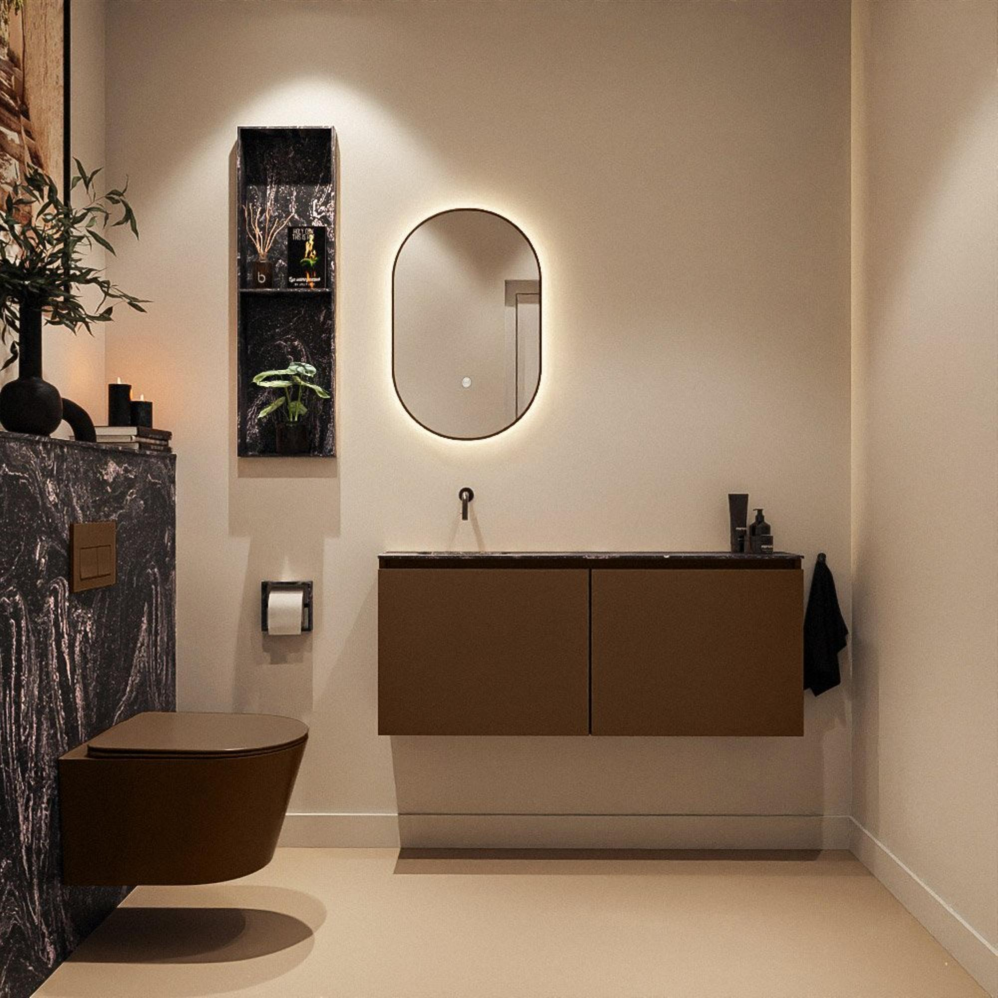La couleur bois rustique du meuble apporte immédiatement chaleur et atmosphère à vos toilettes, tandis que le lavabo noir Lava crée un contraste contemporain. Cette combinaison s’accorde parfaitement avec les tendances actuelles de salle de bains utilisant des matériaux naturels, des accents noirs et des lignes minimalistes. Comme le meuble est sans poignées, l’ensemble reste épuré et harmonieux, sans interruption superflue sur la façade. Le lavabo en Solid Surface présente un aspect fin et moderne tout en offrant une sensation de solidité et de grande qualité. La combinaison de couleurs se marie facilement avec des robinets noirs, des accessoires noir mat ou au contraire des métaux brossés, ce qui vous permet de prolonger votre propre style dans les moindres détails.